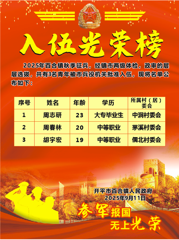 2025年秋季征兵工作開展以來,百合鎮(zhèn)廣大適齡青年積極響應(yīng)祖國(guó)號(hào)召,踴躍報(bào)名參軍,經(jīng)過嚴(yán)格挑選、層層把關(guān),共有3名優(yōu)秀青年被批準(zhǔn)入伍,將分批啟程奔赴軍營(yíng)。