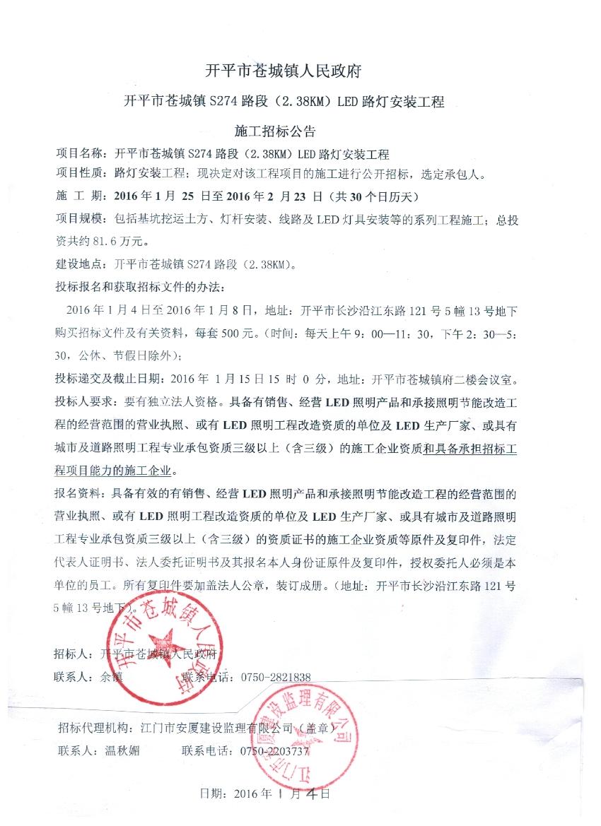 開平市蒼城鎮S274路段(2.38KM)LED路燈安裝工裝施工招標公告