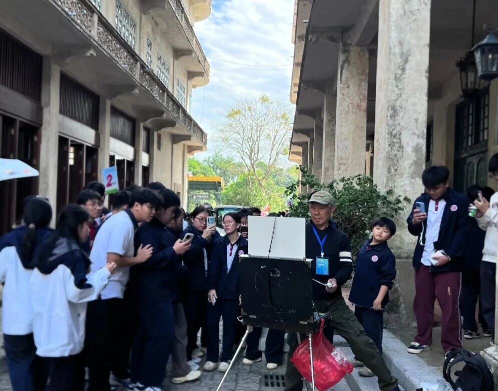 旅美開平籍美術(shù)家司徒維健先生提筆創(chuàng)作,筆觸厚重扎實,引得學(xué)生駐足圍觀,近距離感受創(chuàng)作氛圍。
