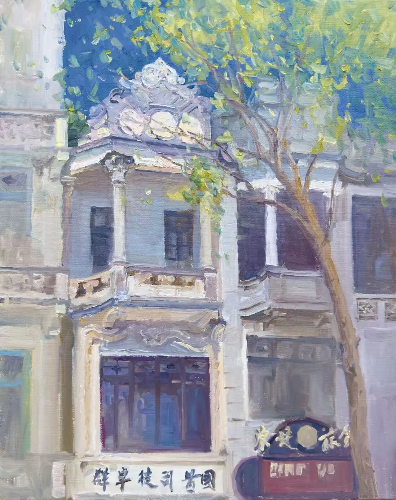 美國油畫家協會大師級會員司徒綿先生,以凝練有力的筆觸塑造騎樓風貌,記錄兒時居住的老宅,盡顯僑鄉建筑的厚重質感。