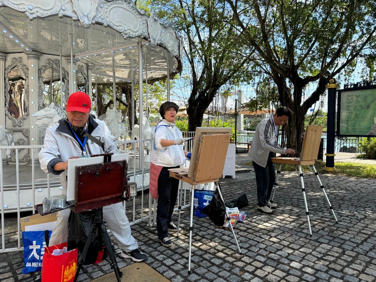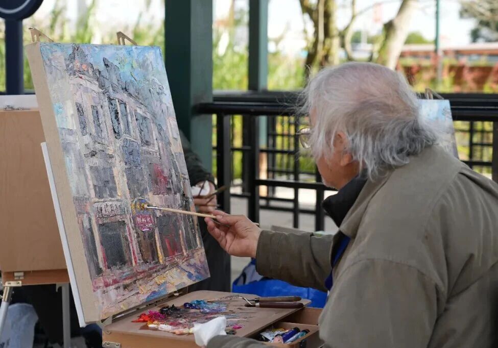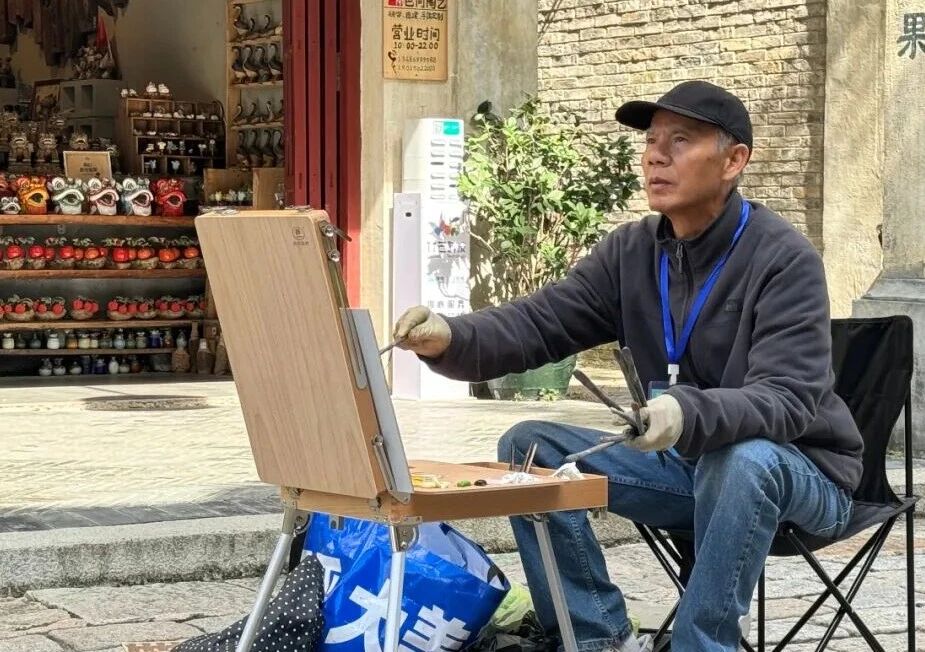 美國油畫家協(xié)會大師級會員司徒維能凝神觀照,揮筆繪寫古鎮(zhèn)晨間街道的鮮活景致。
