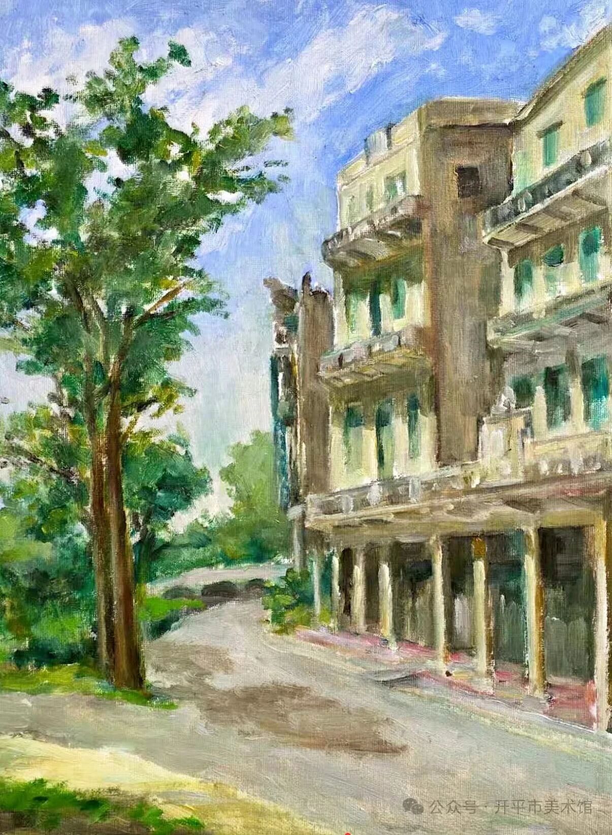 美國油畫家協(xié)會大師級會員司徒綿先生,以凝練有力的筆觸塑造騎樓風貌,記錄兒時居住的老宅,盡顯僑鄉(xiāng)建筑的厚重質感。