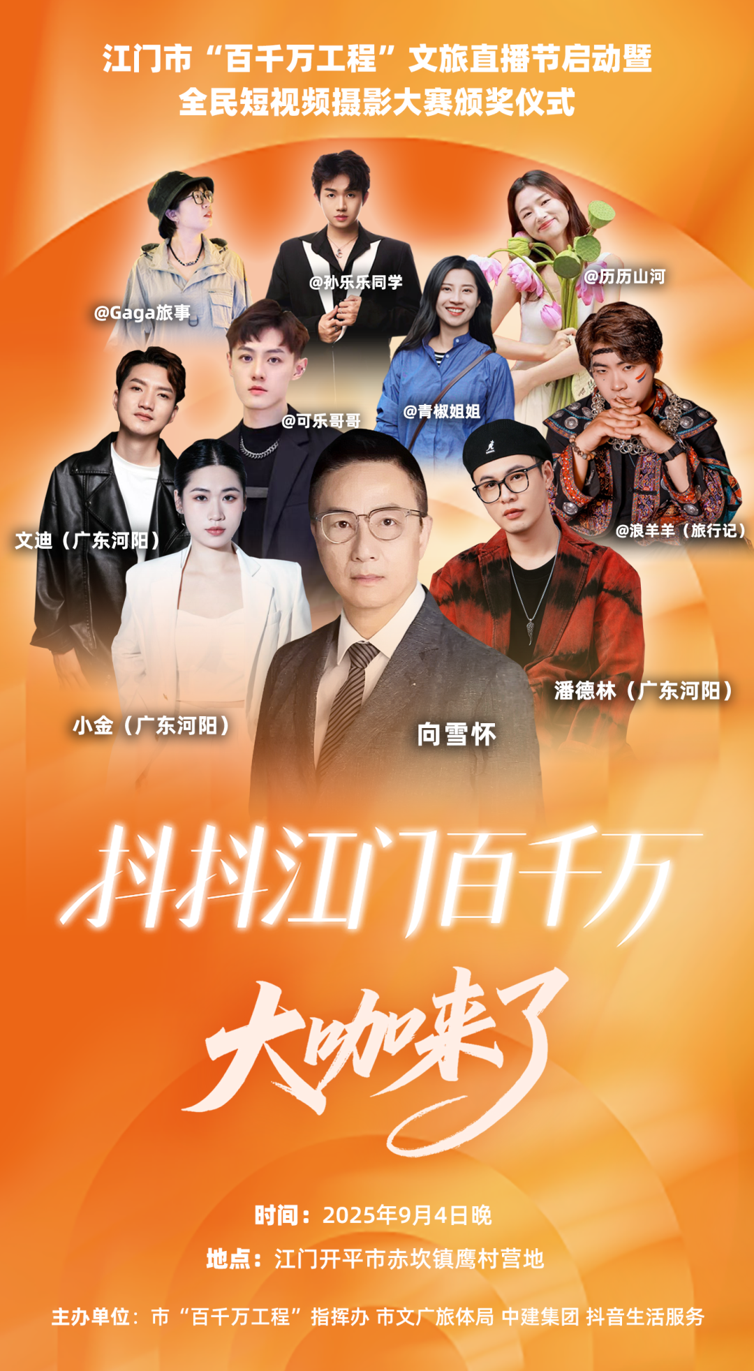 各大獎(jiǎng)項(xiàng)到底花落誰家?當(dāng)天晚上,祖籍江門的香港著名詞作家與音樂人向雪懷,將攜@潘德林(廣東河陽)等江門音樂人,以及@可樂哥哥、@浪羊羊(旅行記)、@歷歷山河、@孫樂樂同學(xué)、@青椒姐姐、@Gaga旅事等網(wǎng)絡(luò)達(dá)人,與你一同見證榮耀時(shí)刻。