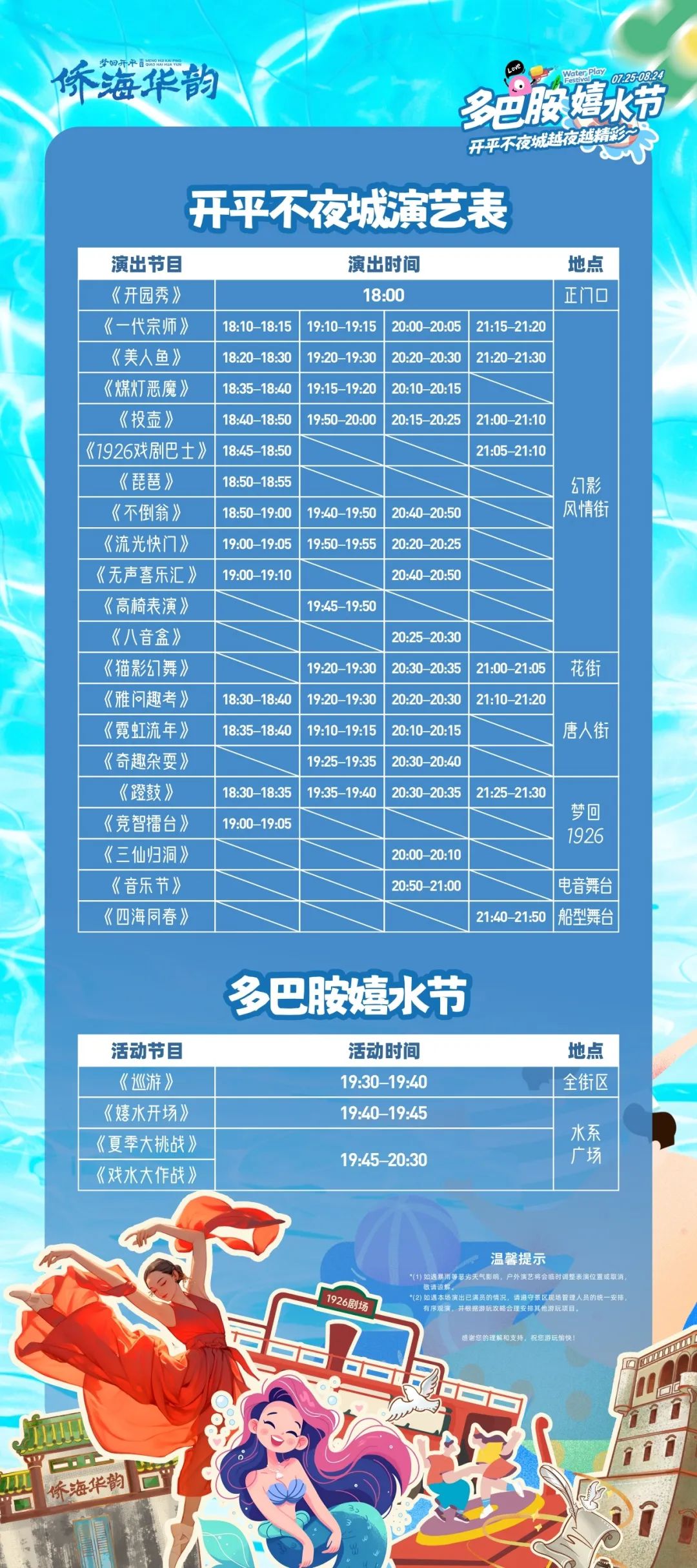 嬉水巡游 發(fā)動熱浪反彈的超級大招 水花瞬間在開平不夜城的每一寸快樂空間炸開 三伏天?全部都彈走! 戲水大作戰(zhàn) 甩開酷熱三伏天 “通緝40 ℃”的熱浪大戰(zhàn)一觸即發(fā)!!! 靈活穿梭在五彩的水槍射線中 一秒擊走全身熱量 泡沫奇遇 裝載了滿滿的多巴胺 終于可以放下大人的包袱,跌進反重力泡泡云 泡泡炸開瞬間,童真的小旋風鋪面而來 電音狂歡 燈光和音響已就緒 一起來鎖定舞臺、統(tǒng)治舞池! 隨著節(jié)奏搖擺 迎接音浪風暴吧~ 開園秀 喚醒快樂的色彩,引爆快樂因子! 酣暢淋漓的歡迎舞率先拉滿你的情緒 熱情四射,歡樂得讓人尖叫~ 胖胖美人魚 今夏的開平不夜城論誰最搶眼? 當然是白白胖胖又逗趣的網(wǎng)紅美人魚了~ 來個氣泡比心,再來個隔空飛吻 可愛滿分! 八音盒 真人版八音盒故事上演 你猜是魔術(shù)師操縱著洋娃娃 還是洋娃娃控制了魔術(shù)師? 夜幕中,引你進入神秘世界…… 音樂節(jié) 超強勁音浪和心臟共振 “砰砰”心跳聲是自帶的混響 多巴胺直線飆升,尖叫才是唯一的解藥! 四海同春 重頭戲絕不能錯過~ 磅礴宏偉的大船之上 正上演一場赤坎的百年古埠傳奇 磅礴如虹,向你述說歲月的故事 50+中外精彩好戲連臺 誰說現(xiàn)實沒有時光機? 王牌演繹,50+中外好戲不容錯過 《1926戲劇巴士》《一代宗師》《不倒翁》 《投壺》《霓虹流年》…… 游走在不同的主題風情街道 讓您完全融入每一個精彩年代 10+項游樂設(shè)施放肆開玩 碰碰車、飛椅、海盜船、無軌小火車 還有玻璃高臺滑行的高臺滑水道! 10+款趣味機動游戲,讓心跳加速 把酷暑遠遠甩掉~ 玩累了?直接奔進美食天堂! 冰淇淋、暴打檸檬茶、冰爽酸梅湯…… 放肆吃喝無壓力 開平不夜城·開心大舞臺新玩法上線! 愛表演愛舞臺的你,請速速來報名! 全場尖叫聲只為你! 這個夏天,來開平不夜城 趕走三伏天,一起走花路吧! ?? 演藝表 ?? 不夜城精彩節(jié)目,看這張演藝表就夠了! Q1:園區(qū)營業(yè)時間? 工作日:16:00-22:00/周末:11:00-23:00 Q2:入園是否免費? 是的,免票入場,演藝活動任意看,游樂設(shè)施按具體項目收費。 Q3:景區(qū)位置及停車信息? 導航至:赤坎鎮(zhèn)崇文路33號夢回開平僑海華韻