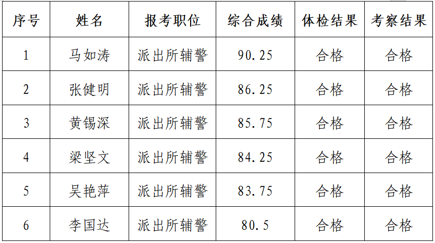 經面試、體檢和考察等程序,馬如濤、張健明、黃錫深、梁堅文、吳艷萍、李國達同志符合開平市公安局赤坎派出所公開招聘輔警崗位的資格條件,擬同意聘用,現予以公示。公示期間,如對擬聘用人員名單有異議,請以書面形式向我們反映并注明聯(lián)系方式(無聯(lián)系方式的恕不受理)。