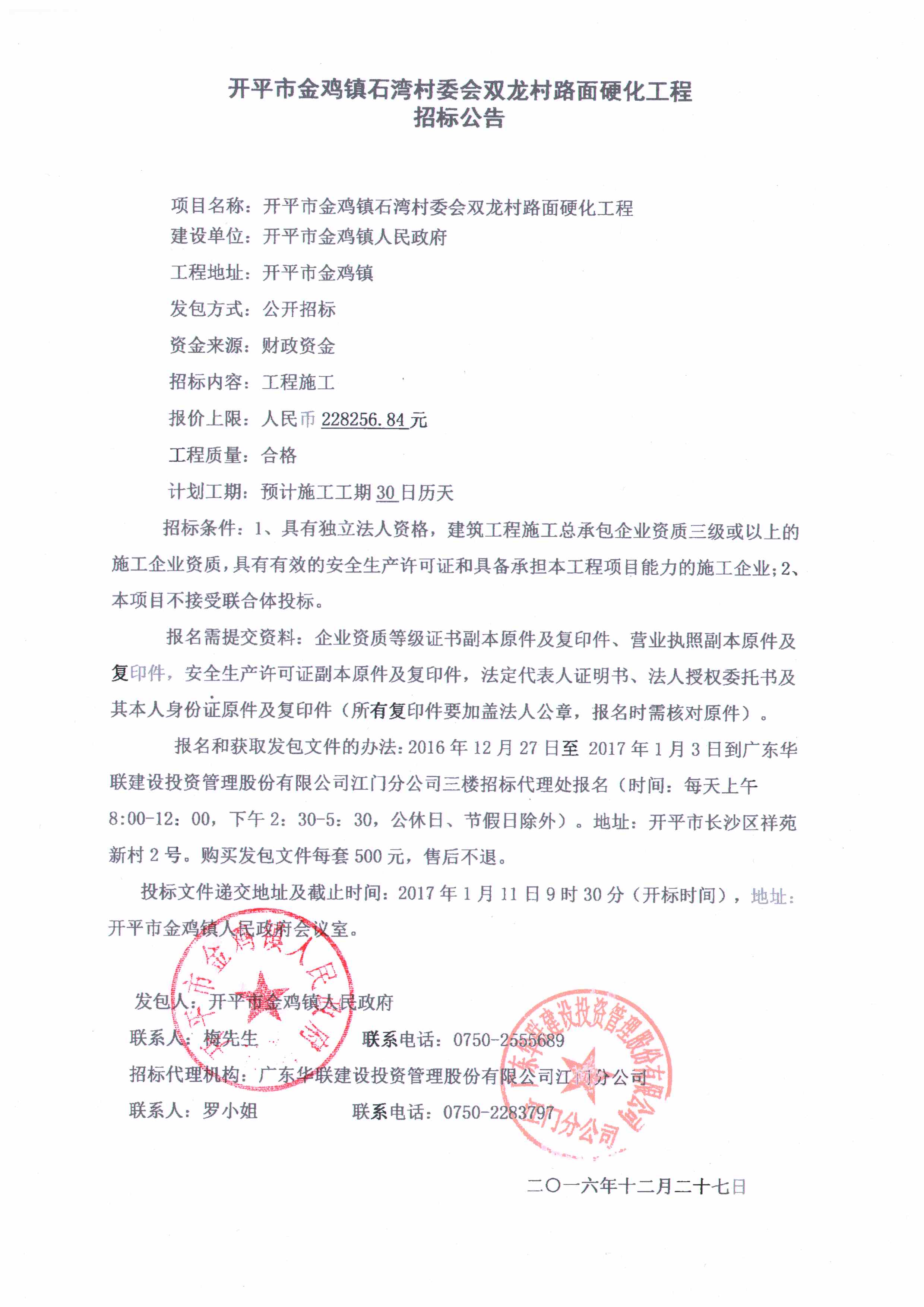 開平市金雞鎮(zhèn)石灣村委會雙龍村路面硬化工程招標公告