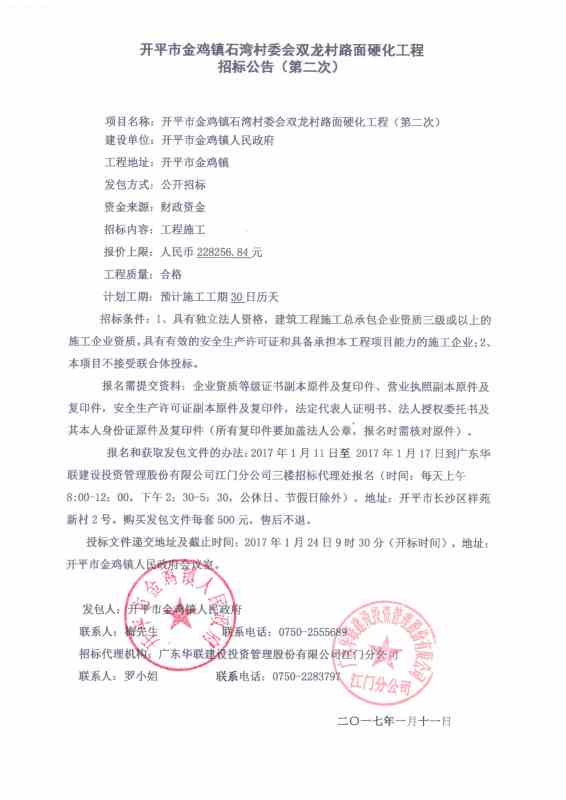 開平市金雞鎮石灣村委會雙龍村路面硬化工程(第二次)