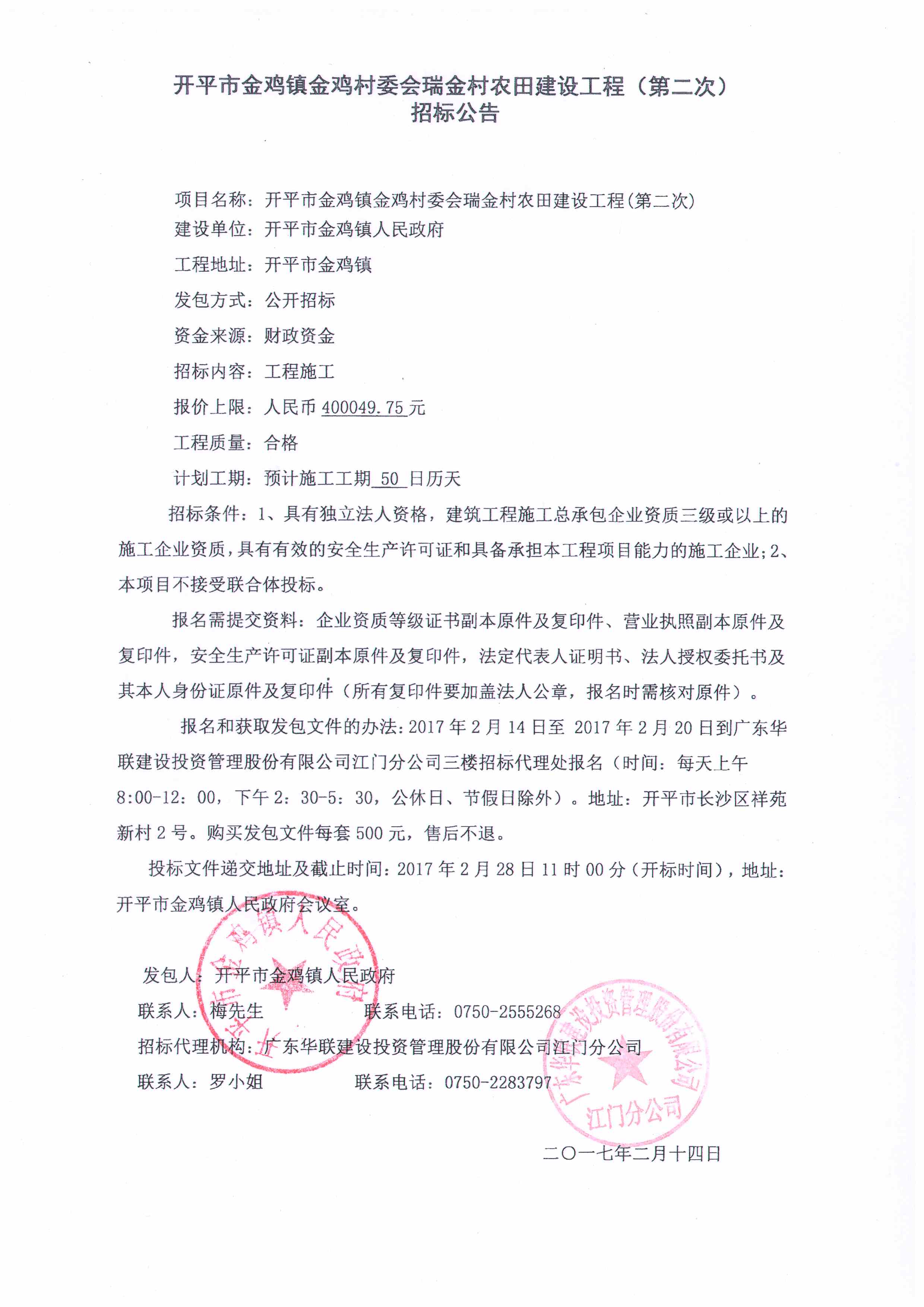 開平市金雞鎮金雞村委會瑞金村農田建設工程招標公告(第二次)
