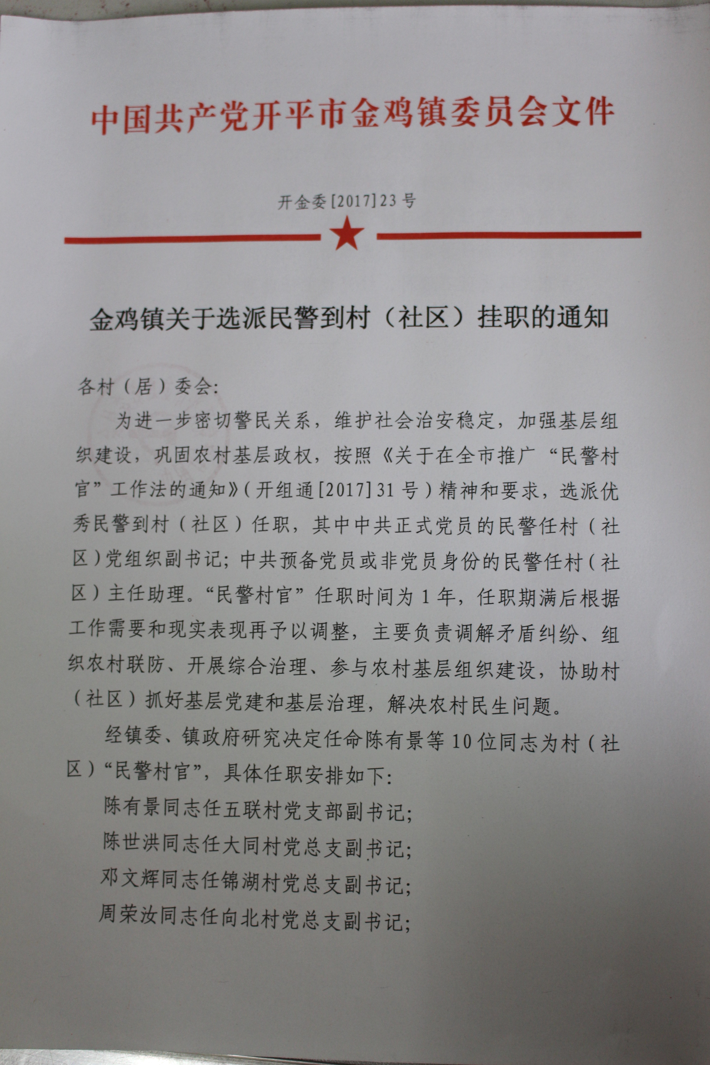 [人事任免]金雞鎮關于選派民警到村(社區)掛職的通知