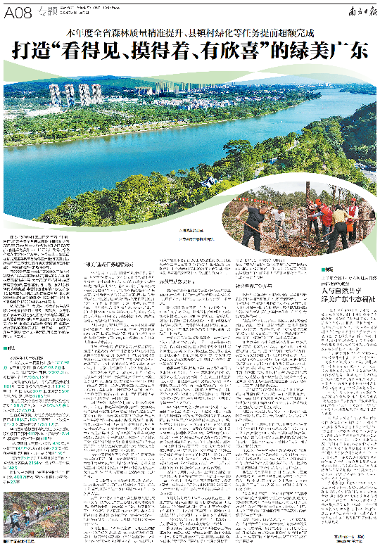 8月15日是全國(guó)生態(tài)日。目前,廣東今年全省完成森林質(zhì)量精準(zhǔn)提升357.99萬(wàn)畝(其中林分優(yōu)化提升213.53萬(wàn)畝、森林撫育提升144.46萬(wàn)畝),縣鎮(zhèn)村綠化種植苗木2108.2萬(wàn)株。在今年上半年提前超額完成全年度林分優(yōu)化提升任務(wù)的基礎(chǔ)上,綠美廣東生態(tài)建設(shè)的兩項(xiàng)關(guān)鍵數(shù)據(jù)仍在不斷攀升,全省綠化造林的熱情不減。 自2022年底,《中共廣東省委關(guān)于深入推進(jìn)綠美廣東生態(tài)建設(shè)的決定》審議通過(guò)以來(lái),森林質(zhì)量精準(zhǔn)提升等“六大行動(dòng)”不斷推進(jìn),多項(xiàng)關(guān)鍵生態(tài)指標(biāo)顯著向好。如今的廣東大地,多樣的森林類型、豐富的濕地環(huán)境不僅為廣東1.2億常住人口創(chuàng)造良好的居住環(huán)境,更為逾6600種野生高等植物、近1100種陸生野生脊椎動(dòng)物和超12000種昆蟲(chóng)提供家園。 從“綠起來(lái)”到“美起來(lái)”,綠美廣東生態(tài)建設(shè)帶來(lái)的變化正切實(shí)惠及廣大群眾。從粵北的廣袤森林,到粵東粵西的綿長(zhǎng)海岸,再到珠三角的森林城市群,森林質(zhì)量的悄然變化不僅美了環(huán)境,更創(chuàng)造了致富增收新機(jī)遇,生態(tài)產(chǎn)品及其價(jià)值實(shí)現(xiàn)方式進(jìn)一步豐富——綠美廣東生態(tài)建設(shè)“看得見(jiàn)、摸得著、有欣喜”的愿景逐步走進(jìn)現(xiàn)實(shí)。 《南方日?qǐng)?bào)》專版報(bào)道 “綠美”重點(diǎn)任務(wù)超額完成 今年以來(lái),廣東以“超額完成,看得見(jiàn)、摸得著、有欣喜”為要求,加速推進(jìn)森林質(zhì)量精準(zhǔn)提升和綠美廣東生態(tài)建設(shè)示范點(diǎn)、示范帶建設(shè),帶動(dòng)提升城鄉(xiāng)綠化美化水平。截至8月初,廣東已完成林分優(yōu)化提升213.53萬(wàn)畝,森林撫育提升144.46萬(wàn)畝,完成新造林撫育131.25萬(wàn)畝;市、縣、鎮(zhèn)新增綠化面積32003.3畝、新增綠化帶長(zhǎng)度5358.1公里;對(duì)全省122個(gè)縣區(qū)、1609個(gè)圩鎮(zhèn)、2.65萬(wàn)個(gè)行政村進(jìn)行綠化,計(jì)劃種植苗木1235.7萬(wàn)株,目前已種植2108.2萬(wàn)株,超額完成計(jì)劃任務(wù)。完成高速公路出入口綠化品質(zhì)提升超100處,國(guó)省道綠化品質(zhì)提升超1000公里。 兩項(xiàng)重要工作的提前完成,離不開(kāi)林木種苗的有效保障。截至7月中旬,全省已落實(shí)苗木6703.71萬(wàn)株,超量完成任務(wù);落實(shí)苗木單位128家,其中保障性苗圃65家,有力保障2024年林分優(yōu)化任務(wù)苗木需求。 此外,省林業(yè)局、省農(nóng)墾總局、省農(nóng)業(yè)農(nóng)村廳推進(jìn)8個(gè)總規(guī)模1200畝儲(chǔ)備能力120萬(wàn)株的優(yōu)質(zhì)苗木儲(chǔ)備基地建設(shè),截至7月中旬,共采購(gòu)儲(chǔ)備苗木約91.35萬(wàn)株,儲(chǔ)備基地基礎(chǔ)設(shè)施建設(shè)也在有序開(kāi)展。共安排各地各單位優(yōu)質(zhì)苗木約75.93萬(wàn)株,進(jìn)一步優(yōu)化和保障縣鎮(zhèn)村綠化苗木供應(yīng)。 城鄉(xiāng)綠化美化,群眾可感可知。目前,全省已建設(shè)森林鄉(xiāng)村39個(gè)、綠美古樹(shù)鄉(xiāng)村15個(gè)、綠美紅色鄉(xiāng)村16個(gè)。全省共有古樹(shù)名木85561株,其中一級(jí)古樹(shù)770株,二級(jí)古樹(shù)4822株,三級(jí)古樹(shù)79888株,名木81株。計(jì)劃建設(shè)古樹(shù)公園20個(gè)、古樹(shù)搶救復(fù)壯瀕危古樹(shù)250株。目前已建設(shè)古樹(shù)公園3個(gè)、搶救復(fù)壯古樹(shù)112株。 堅(jiān)持“興綠”也為群眾打通“兩山”轉(zhuǎn)化致富路。廣東穩(wěn)步推進(jìn)集體林權(quán)制度改革,貫徹落實(shí)《深化集體林權(quán)制度改革方案》,研究制定出臺(tái)《廣東省深化集體林權(quán)制度改革實(shí)施方案》,創(chuàng)新公益林利用管理和林業(yè)發(fā)展用地保障,著力打造油茶、竹子、林草中藥材、花卉苗木、家具加工、香料香精、生態(tài)旅游、森林康養(yǎng)等林業(yè)產(chǎn)業(yè)集群,打造“粵林+”特色品牌;配套出臺(tái)《綠美廣東生態(tài)建設(shè)財(cái)政激勵(lì)政策》《廣東省省級(jí)以上公益林結(jié)合森林質(zhì)量分類差異化補(bǔ)償方案》,按計(jì)劃下達(dá)2023年綠美廣東生態(tài)建設(shè)激勵(lì)資金1.08億元,省級(jí)以上公益林平均補(bǔ)償標(biāo)準(zhǔn)提高至47元/畝。 省林業(yè)局相關(guān)負(fù)責(zé)人介紹,下半年是開(kāi)展森林撫育的重要時(shí)間。省林業(yè)局將進(jìn)一步加大造林綠化督導(dǎo)力度,督促各地落實(shí)綠美廣東生態(tài)建設(shè)重點(diǎn)任務(wù)項(xiàng)目資金,嚴(yán)格按序時(shí)進(jìn)度開(kāi)展造林撫育工作,確保9月底前全面完成森林撫育提升任務(wù)。 “同時(shí),緊密配合省委組織部、省交通、住建、農(nóng)業(yè)農(nóng)村廳等部門,加強(qiáng)對(duì)各地縣鎮(zhèn)村綠化工作指導(dǎo),抓好縣鎮(zhèn)村綠化后期管護(hù)工作。”該負(fù)責(zé)人說(shuō)。 其中,森林防火和林業(yè)有害生物防治是完成森林撫育、守護(hù)綠美廣東生態(tài)建設(shè)成果的重要舉措。今年上半年,出動(dòng)近23萬(wàn)人次開(kāi)展森林防火工作,全省整改火災(zāi)隱患2134處,整改森林安全隱患1483處;松材線蟲(chóng)病等林業(yè)有害生物防