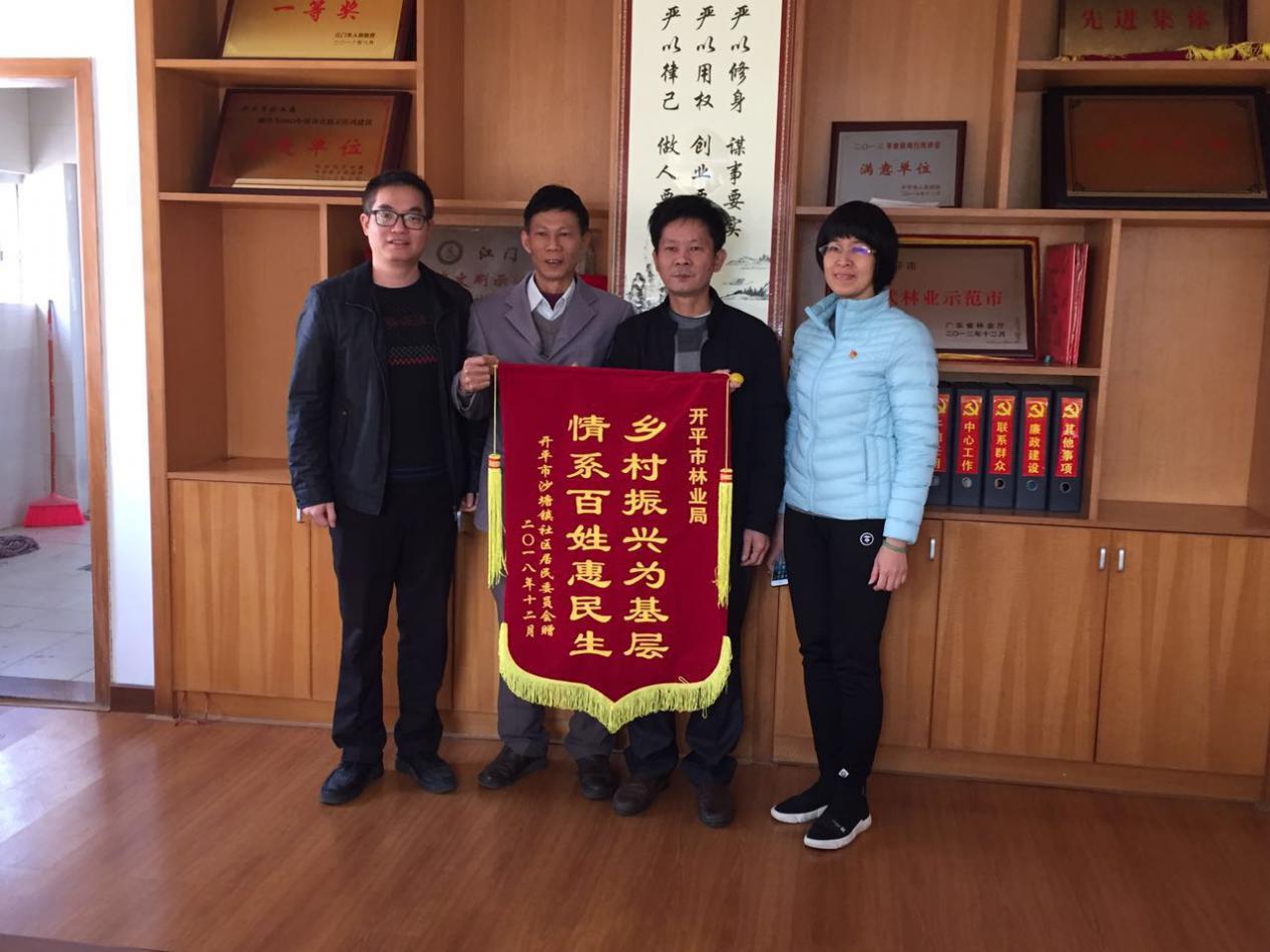 鄉(xiāng)村振興為基層、情系百姓惠民生 ——市林業(yè)局“送苗下鄉(xiāng)”助力美麗鄉(xiāng)村建設(shè),沙塘鎮(zhèn)社區(qū)居委會贈送錦旗表謝意 2019年1月24日上午,沙塘鎮(zhèn)政府分管領(lǐng)導(dǎo)和農(nóng)辦及鎮(zhèn)社區(qū)居委會有關(guān)同志一行3人將一面印有“鄉(xiāng)村振興為基層、情系百姓惠民生”字樣的鮮紅錦旗送到我局,對我局開展“送苗下鄉(xiāng)”活動,大力支持該鎮(zhèn)建設(shè)生態(tài)居宜鄉(xiāng)村表示由衷的感謝。我局馮岸良副局長和李雪清紀(jì)檢組長接收了錦旗。 馮岸良副局長表示,收到基層贈送的錦旗,林業(yè)部門倍感到自身的責(zé)任,也將激發(fā)全體林業(yè)干部職工以高度的政治責(zé)任感和務(wù)實的工作作風(fēng),極探索綠色發(fā)展的長效機(jī)制,著力改善全市生態(tài)宜居環(huán)境,為扎實推進(jìn)新一輪綠化開平作出更大貢獻(xiàn)。同時希望村民們加強(qiáng)苗木日常管護(hù),確保植樹成效,林業(yè)部門將提供技術(shù)指導(dǎo),共同鞏固綠化美化建設(shè)成果。