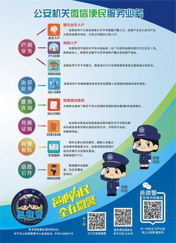江門市開平邑微警是開平市公安局根據江門市公安局的統一部署通過微信平臺開通的網上公安局。