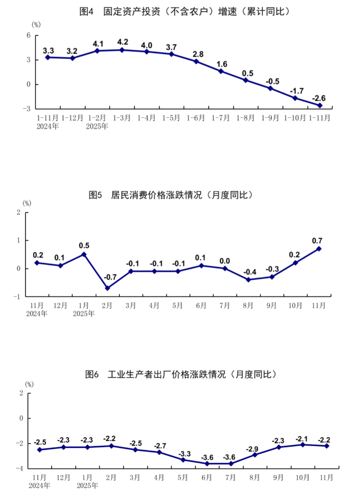 11月份,在以習(xí)近平同志為核心的黨中央堅(jiān)強(qiáng)領(lǐng)導(dǎo)下,各地區(qū)各部門認(rèn)真貫徹落實(shí)黨中央、國務(wù)院決策部署,堅(jiān)持穩(wěn)中求進(jìn)工作總基調(diào),深入實(shí)施更加積極有為的宏觀政策,縱深推進(jìn)全國統(tǒng)一大市場建設(shè),著力推動(dòng)高質(zhì)量發(fā)展,生產(chǎn)供給基本平穩(wěn),就業(yè)形勢(shì)總體穩(wěn)定,市場價(jià)格繼續(xù)改善,新質(zhì)生產(chǎn)力穩(wěn)步發(fā)展,經(jīng)濟(jì)運(yùn)行延續(xù)總體平穩(wěn)、穩(wěn)中有進(jìn)發(fā)展態(tài)勢(shì)。 一、全年糧食實(shí)現(xiàn)豐收,穩(wěn)定在1.4萬億斤以上 全年全國糧食產(chǎn)量14298億斤,比上年增加167.5億斤,增長1.2%,穩(wěn)定在1.4萬億斤以上。其中,秋糧產(chǎn)量10732億斤,比上年增加163.6億斤,增長1.5%。全國谷物產(chǎn)量13204億斤,比上年增加158.4億斤,增長1.2%。糧食播種面積增加、單產(chǎn)提高。全國糧食播種面積17.91億畝,比上年增加134.8萬畝,增長0.1%;糧食單產(chǎn)399.1公斤/畝,每畝產(chǎn)量比上年增加4.4公斤,增長1.1%。 二、工業(yè)生產(chǎn)穩(wěn)定增長,裝備制造業(yè)和高技術(shù)制造業(yè)增長較快 11月份,全國規(guī)模以上工業(yè)增加值同比增長4.8%,環(huán)比增長0.44%。分三大門類看,采礦業(yè)增加值同比增長6.3%,制造業(yè)增長4.6%,電力、熱力、燃?xì)饧八a(chǎn)和供應(yīng)業(yè)增長4.3%。裝備制造業(yè)增加值同比增長7.7%,高技術(shù)制造業(yè)增加值增長8.4%,分別快于全部規(guī)模以上工業(yè)增加值2.9和3.6個(gè)百分點(diǎn)。分經(jīng)濟(jì)類型看,國有控股企業(yè)增加值同比增長4.2%;股份制企業(yè)增長5.2%,外商及港澳臺(tái)投資企業(yè)增長3.4%;私營企業(yè)增長3.2%。分產(chǎn)品看,3D打印設(shè)備、工業(yè)機(jī)器人、新能源汽車產(chǎn)品產(chǎn)量同比分別增長100.5%、20.6%、17.0%。1—11月份,全國規(guī)模以上工業(yè)增加值同比增長6.0%。11月份,制造業(yè)采購經(jīng)理指數(shù)為49.2%,比上月上升0.2個(gè)百分點(diǎn);企業(yè)生產(chǎn)經(jīng)營活動(dòng)預(yù)期指數(shù)為53.1%,上升0.3個(gè)百分點(diǎn)。1—10月份,全國規(guī)模以上工業(yè)企業(yè)實(shí)現(xiàn)利潤總額59503億元,同比增長1.9%。 三、服務(wù)業(yè)平穩(wěn)增長,現(xiàn)代服務(wù)業(yè)發(fā)展向好 11月份,全國服務(wù)業(yè)生產(chǎn)指數(shù)同比增長4.2%。分行業(yè)看,信息傳輸、軟件和信息技術(shù)服務(wù)業(yè),租賃和商務(wù)服務(wù)業(yè),金融業(yè)生產(chǎn)指數(shù)同比分別增長12.9%、8.4%、5.1%,分別快于服務(wù)業(yè)生產(chǎn)指數(shù)8.7、4.2、0.9個(gè)百分點(diǎn)。1—11月份,全國服務(wù)業(yè)生產(chǎn)指數(shù)同比增長5.6%。1—10月份,規(guī)模以上服務(wù)業(yè)企業(yè)營業(yè)收入同比增長7.6%。11月份,服務(wù)業(yè)商務(wù)活動(dòng)指數(shù)為49.5%,服務(wù)業(yè)業(yè)務(wù)活動(dòng)預(yù)期指數(shù)為55.9%。其中,鐵路運(yùn)輸、電信廣播電視及衛(wèi)星傳輸服務(wù)、貨幣金融服務(wù)等行業(yè)商務(wù)活動(dòng)指數(shù)位于55.0%以上較高景氣區(qū)間。 四、市場銷售規(guī)模擴(kuò)大,服務(wù)零售增長加快 11月份,社會(huì)消費(fèi)品零售總額43898億元,同比增長1.3%;環(huán)比下降0.42%。按經(jīng)營單位所在地分,城鎮(zhèn)消費(fèi)品零售額37684億元,同比增長1.0%;鄉(xiāng)村消費(fèi)品零售額6214億元,增長2.8%。按消費(fèi)類型分,商品零售額37841億元,增長1.0%;餐飲收入6057億元,增長3.2%。基本生活類和部分升級(jí)類商品銷售增長較快。限額以上單位糧油食品類、通訊器材類、文化辦公用品類商品零售額同比分別增長6.1%、20.6%、11.7%。1—11月份,社會(huì)消費(fèi)品零售總額456067億元,同比增長4.0%。全國網(wǎng)上零售額144582億元,同比增長9.1%。其中,實(shí)物商品網(wǎng)上零售額118193億元,增長5.7%,占社會(huì)消費(fèi)品零售總額的比重為25.9%。1—11月份,服務(wù)零售額同比增長5.4%,增速比1—10月份加快0.1個(gè)百分點(diǎn)。其中,文體休閑服務(wù)類、通訊信息服務(wù)類、旅游咨詢租賃服務(wù)類、交通出行服務(wù)類零售額較快增長。 五、固定資產(chǎn)投資同比下降,制造業(yè)投資保持增長 1—11月份,全國固定資產(chǎn)投資(不含農(nóng)戶)444035億元,同比下降2.6%;扣除房地產(chǎn)開發(fā)投資,全國固定資產(chǎn)投資增長0.8%。分領(lǐng)域看,基礎(chǔ)設(shè)施投資同比下降1.1%,制造業(yè)投資增長1.9%,房地產(chǎn)開發(fā)投資下降15.9%。全國新建商品房銷售面積78702萬平方米,同比下降7.8%;新建商品房銷售額75130億元,下降11.1%。分產(chǎn)業(yè)看,第一產(chǎn)業(yè)投資同比增長2.7%,第二產(chǎn)業(yè)投資增長3.9%,第三產(chǎn)業(yè)投資下降6.3%。民間投資同比下降5.3%;扣除房地產(chǎn)開發(fā)投資,民間投資下降0.7%。高技術(shù)產(chǎn)業(yè)中,信息服務(wù)業(yè),航空、航天器及設(shè)備制造業(yè)投資同比分別增長29.6%、19.7%。11月份,固定資產(chǎn)投資(不含農(nóng)戶)環(huán)比下降1.03%。 六、貨物進(jìn)出口增速回升,貿(mào)易結(jié)構(gòu)繼續(xù)優(yōu)化 11月份,貨物進(jìn)出口總額38987億元,同比增長4.1%,比上月加快4.0個(gè)百分點(diǎn)。其中,出口23456億元,增長5.7