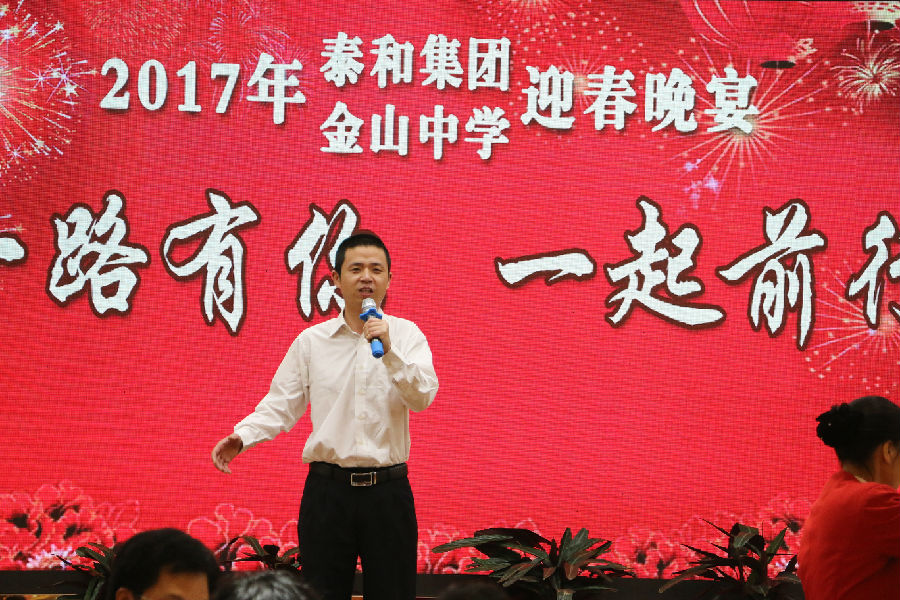 宴會上,金山中學鄭娟馥校長回顧了過去的2016 年取得的輝煌成績,特別是在中考中,金山中學包攬開平市前10名,榮獲余錦炯、張襯獎學助學獎金近30萬元。并送上親切問候和誠摯的祝福:祝泰和集團業務蒸蒸日上,生意興隆;金山中學越辦越好,再創佳績;大家工作順利,生活愉快!