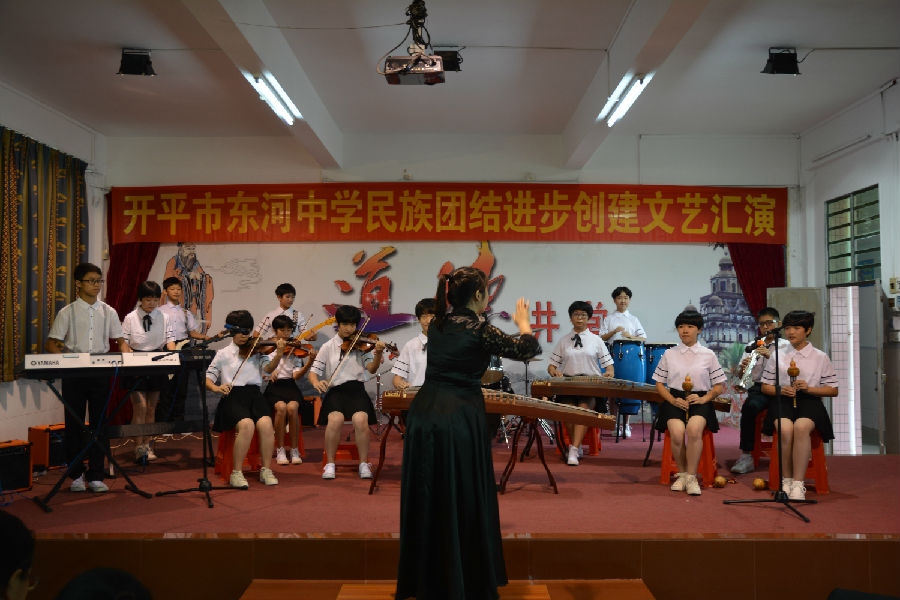 檢查組參觀了東河中學校園文化,觀看了東河中學“促進民族團結”的宣傳專欄、“民族大團結”專題學生美術作品展、富有民族特色的音樂舞蹈演出等。具有濃郁民族特色的美術作品和音樂舞蹈的演出贏得了檢查組的一致贊賞。隨后,集中會議室查閱相關資料和聽取報告,東河中學劉權均副校長做了題為《凝聚民族情奏響團結歌》的工作匯報。開平市宗教局陳月嫦局長、開平市教育局基教股室負責人鄺學良同志分別作了講話。
