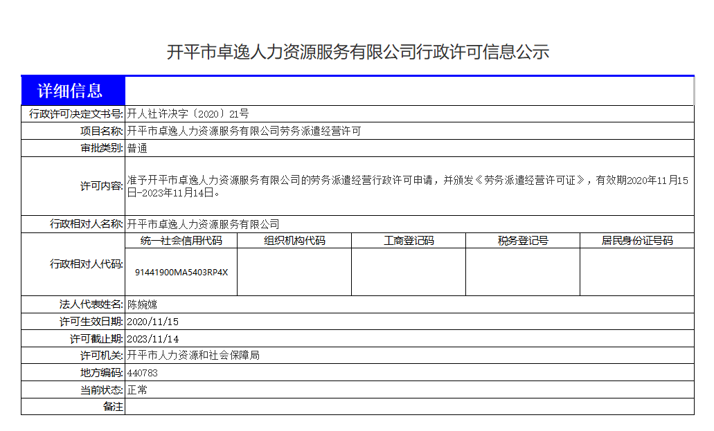 開平市卓逸人力資源服務有限公司行政許可信息公示