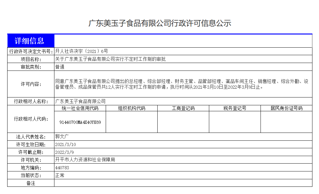 廣東美玉子食品有限公司行政許可信息公示