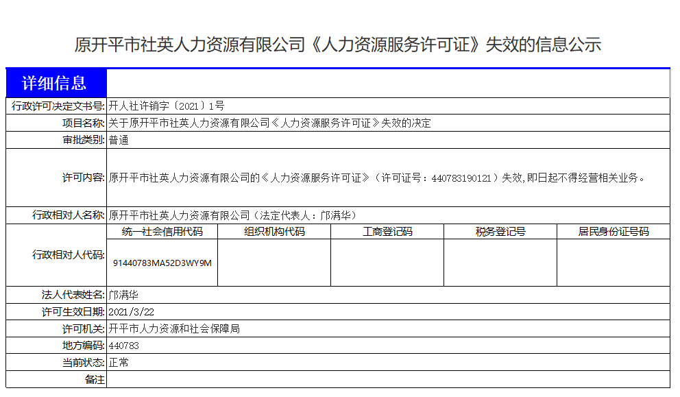 原開平市社英人力資源有限公司《人力資源服務許可證》失效的信息公示