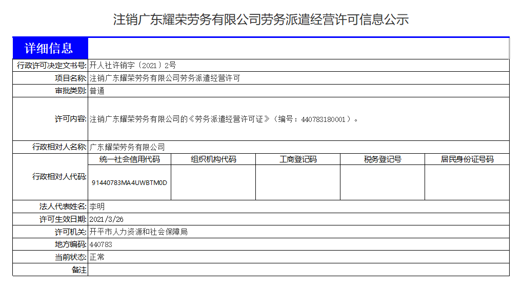注銷(xiāo)廣東耀榮勞務(wù)有限公司勞務(wù)派遣經(jīng)營(yíng)許可信息公示