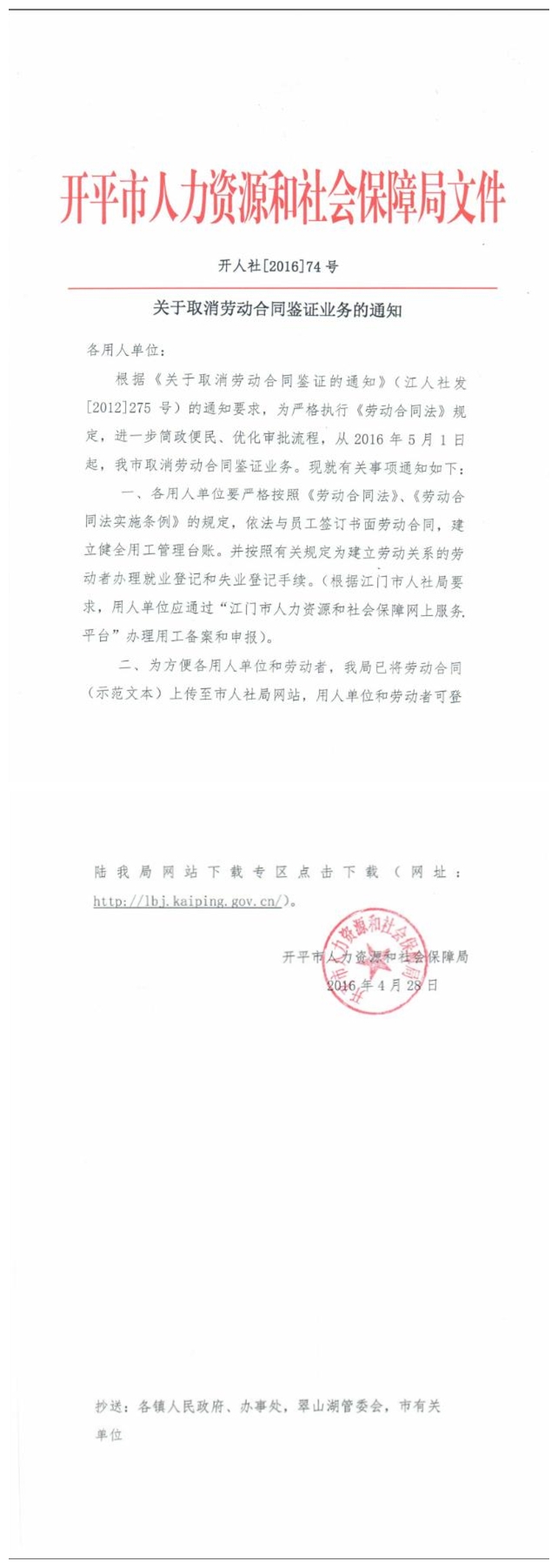 關于取消勞動合同鑒證業務的通知