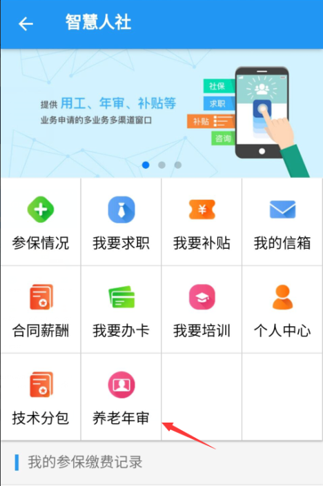 (四)綁定成功后進(jìn)入首頁(yè),點(diǎn)擊“養(yǎng)老年審”功能按鈕進(jìn)入年審界面。