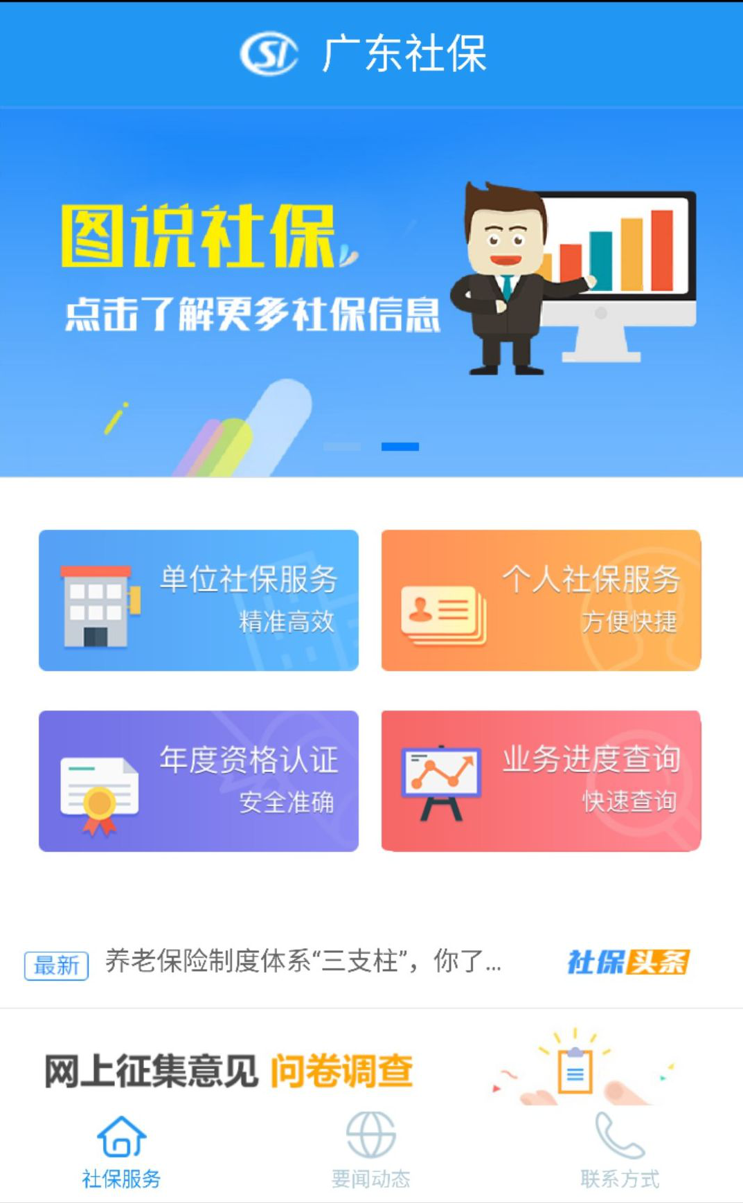 1.掃描二維碼下載“廣東社保”手機(jī)APP,打開(kāi)APP,在社保服務(wù)欄目?jī)?nèi), 點(diǎn)擊“個(gè)人年度資格認(rèn)證” 按鈕, 進(jìn)入服務(wù)界面。