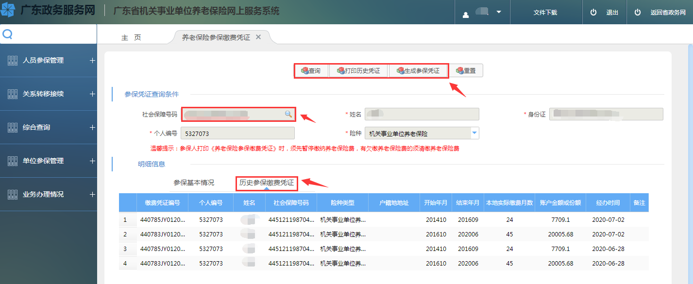 打印路徑:關系轉移接續→養老保險參保繳費憑證→社保號查詢→打印歷史憑證→生成參保憑證