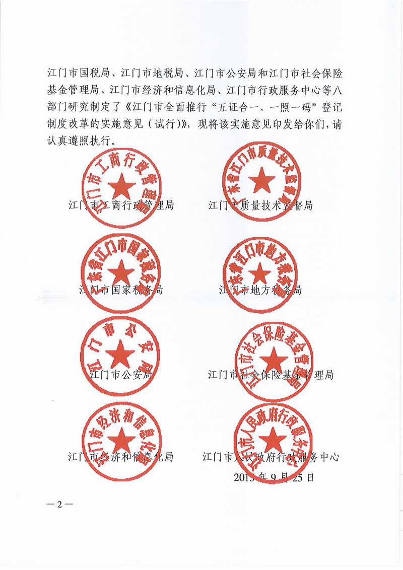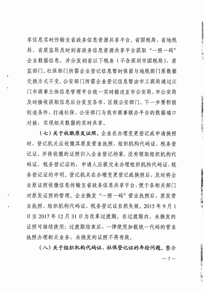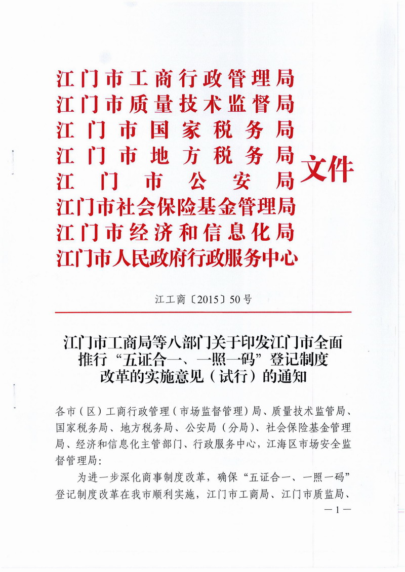 江門市工商局等八部門關于印發江門市全面推行“五證合一、一照一碼”登記制度改革的實施意見(試行)的通知