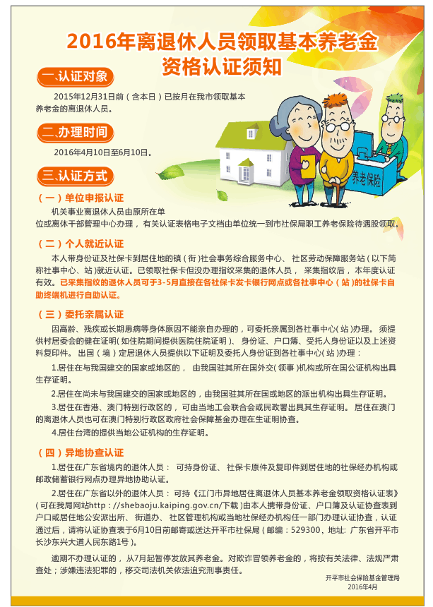 2016年離退休人員領取基本養老金資格認證須知