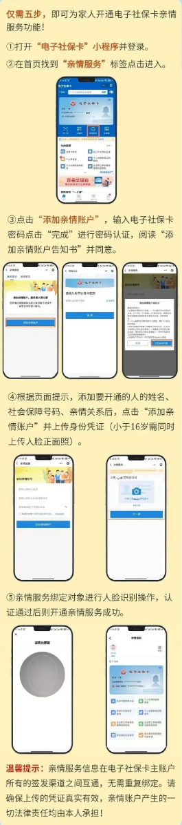 ①每個人的賬戶上只可以綁定父母、子女、配偶等10人,綁定后名額將會被使用且解綁后名額也無法恢復。②只有正常狀態下的實體社保卡才能夠申領電子社保卡。