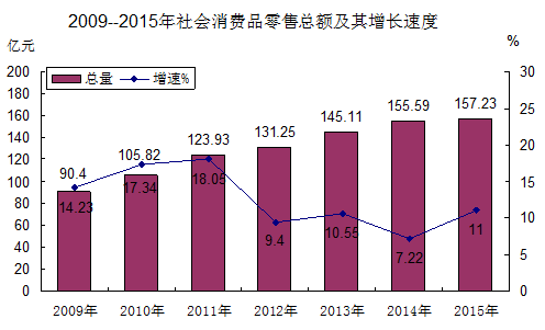 2015年,全市深入貫徹落實上級黨委、政府的各項決策部署,沉著應對各種困難和挑戰,以“奮發圖強、改革攻堅、提質發展”為工作主線,主動適應經濟發展新常態,團結和帶領廣大干部群眾出實招、干實事、求實效,推動經濟社會持續、健康、穩步發展,全市經濟社會發展在“十二五”收官之年取得新的成就。 一、綜合 初步核算,2015年全市實現地區生產總值287.92億元(當年價),比上年增長8.2%。其中:第一產業增加值27.72億元,增長3.2%;第二產業增加值141.58億元,增長8.5%;第三產業增加值118.62億元,增長8.9%。第一、二、三產業增加值的比重為9.63:49.18:41.19。人均地區生產總值4.07萬元。 圖1: 二、農業 全年實現農業總產值50.92億元,比上年增長3.7%。全年糧食作物播種面積67.83萬畝,比上年下降0.10%。其中:水稻種植面積61.86萬畝,比上年增長2.50%。 全年糧食總產量22.56萬噸,比上年增長0.15%,其中:稻谷20.79萬噸,比上年下降0.09%。 圖2: 全市更新造林面積4.68萬畝,比上年增長14.71%;木材砍伐17.75萬立方米,比上年下降2.81%。 畜牧業肉類總產量7.52萬噸,比上年增長3.72%;全年生豬出欄量60萬頭,比上年增長1.68%;家禽出欄量2373.06萬只,比上年增長6.39%;禽蛋全年總產量1.53萬噸,比上年增長24.39%;水產品產量5.18萬噸,比上年增長3.6%。 三、工業和建筑業 2015年,全市規模以上工業企業257家,規模以上工業增加值比上年增長9.1%,工業總產值比上年增長15.37%。工業總產值中,按輕重工分:輕工業增長17.38%,重工業增長13.40%;按企業經濟類型分:外商及港澳臺商投資企業增長13.20%;股份制企業增長17.10%;其他經濟類型增長28.08%。 圖3: 全年規模以上工業企業銷售產值比上年增長11.46%,產品銷售率90.66%,主營業務收入比上年增長9.94%,利潤總額比上年增長54.81%。 全年具有資質等級的總承包和專業承包建筑企業完成總產值125.37億元,比上年增長28.69%。工程結算收入126.24億元,比上年增長94.07%。實現利潤總額5.1億元,比上年增長48.26%。 四、固定資產投資 全年固定資產完成投資總額209.11億元,比上年增長21.16%。其中:房地產完成投資27.86億元,比上年下降6.27%。固定資產投資中,第一產業完成投資2.3億元,比上年下降11.53 %;第二產業完成投資103.93億元,比上年增長35.38%;第三產業完成投資102.88億元,比上年增長10.35%。民資投資穩定增長,全年民資直接投資116.84億元,比上年增長51.03%。 全年商品房施工面積382.90萬平方米,比上年增長24.3%;竣工面積28.17萬平方米,比上年下降37.83%;商品房銷售面積80.22萬平方米,比上年增長56.61%;商品房銷售額34.87億元,比上年增長36.46%。 五、交通運輸和郵電業 全年社會客運量2761萬人,比上年下降0.62%;客運周轉量99811萬人公里,比上年增長2.74%;港口貨物吞吐量985.19萬噸,比上年下降6.44%。 年末市內公路通車里程182.9公里。汽車保有量7.80萬輛,比上年增長15.90%。摩托車保有量21.91萬輛,比上年增長6.57%。公共汽車擁有量0.02萬輛。 年末固定電話用戶16.8萬戶,移動電話用戶79.48萬戶,國際互聯網用戶15.75萬戶,互聯網用戶普及率78.90%。 六、國內貿易 全年社會消費品零售總額157.23億元,比上年增長11.00%。其中:城市消費品零售額111.75億元,比上年增長12.84%;農村消費品零售額45.48億元,比上年增長6.72%。 按行業分,批發零售貿易業實現零售額139.58億元,比上年增長11.57%;住宿和餐飲業實現零售額17.65億元,比上年增長6.68%。其中:限額以上貿易企業實現零售額37.75億元,比上年增長2.43%。 圖4: 七、對外經濟貿易和旅游業 全年海關進出口總值149.1億元,比上年下降8.6%。外貿出口總值124.3億元,比上年下降5.2%。進口總值24.8億元,比上年下降22.7%。實現對外貿易順差99.5億元。 全年實際利用外商直接投資0.55億美元,比上年下降8.99%。合同利用外資0.2億美元,比上年下降80.02%。新簽利用外資合同13宗,比上年下降18.75%,其中:外商直接投資13宗,比上年下降18.75%。外向型企業491家,其中:三資企業411家,來料加工企業80家。 全年旅游業共接待國內外游客573.07萬人次,比上年增長5.59%,其中:國內旅游者491.54萬人次,比上年增長6.30%;國際旅游者81.53萬人次,比上年增長1.50%;實現旅游總收入52.09億元,增長18.01%。全市擁有星級酒店4家,其中:五星級酒店1家,三星級2家,二星級1家。旅游飯店出租率77%。 八、財政金融 全年地方公共財政預算收入21.54億元,比上年增長8.28%;地方公共財政預算支出33.64億元,比上年增長21.09%。 年末金融機構存款余額479.85億元,比上年增長7.51 %。其中:城鄉居民儲蓄存款余額348.69億元,比上年下降0.43%。各項貸款余額225.12億元,比上年增長15.93%。僑匯收入0.50 億美元,比上年下降1.57 %。 九、科學技術和教育 全年科技事業獲得國家級1個、省級三等獎1個、江門市級二等獎5個、三等獎5個的獎勵。專利申請量2366件,專利授權量1342件。高新技術企業31家,其中:國家級27家、地市級4家。民營科技企業55家,其中:省級41家、地市級14家。全市擁有各類專業技術人員2.70萬人。 年末全市有中小學89所,其中完(高、職)中11所,初中19所,小學56所,九年一貫制學校3所,全市在校生共126797人,其中小學生53694人,初中生26244人,高中階段在校生20753人。特殊學校1所,在校生127人。電視大學1所,在校本科生340人,大專學生1181人。業余體校1所。幼兒園82所,在園兒童25979人。小學適齡兒童入學率100%,小學畢業生入學率100%,非正常流動率為0%;15周歲人口初等教育完成率100%,
