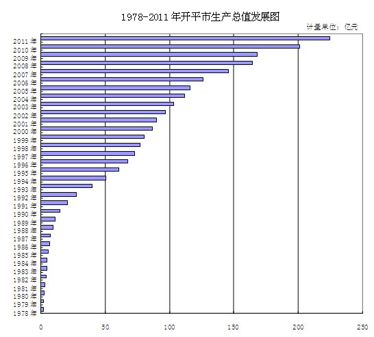 改革開放三十多年,開平市經(jīng)濟(jì)以跨越式發(fā)展的態(tài)勢(shì),經(jīng)濟(jì)總量不斷壯大。2011年我市生產(chǎn)總值是224.84億元,其總量是1978年的119倍。從1978年改革開放到2011年的34年間地區(qū)生產(chǎn)總值的年均增長(zhǎng)速度是15.61%。其發(fā)展經(jīng)歷了以下三個(gè)階段的跨越增長(zhǎng)(見圖1)。第一次跨越:于1989年,創(chuàng)造出經(jīng)濟(jì)總量超10億元,總量達(dá)到11.21億元,比1978年翻了5倍,1978年至1989年的年均增長(zhǎng)率是17.67%;第二次跨越:于2003年,創(chuàng)造出經(jīng)濟(jì)總量超100億,總量達(dá)到103.05億元,比1989年翻了8倍,1990年至2003年的年均增長(zhǎng)率是18.60%;第三次跨越:于2010年,創(chuàng)造出經(jīng)濟(jì)總量超200億,總量達(dá)到201.14億元,比2003年翻了1倍,2004年至2010年的年均增長(zhǎng)率是10.03%。