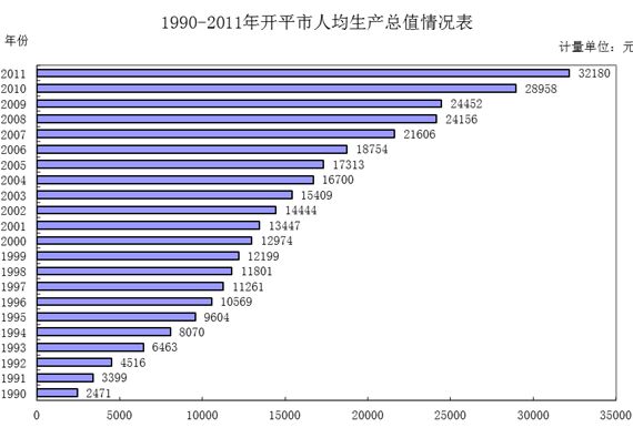 人均地區(qū)生產(chǎn)總值是衡量一個(gè)地區(qū)收入水平的標(biāo)志,也是作為劃分經(jīng)濟(jì)發(fā)展階段的重要指標(biāo)。根據(jù)江門統(tǒng)計(jì)年鑒1990年以來開平市的常住人口數(shù)據(jù)為計(jì)算人均地區(qū)生產(chǎn)總值起點(diǎn),計(jì)算結(jié)果顯示:我市人均生產(chǎn)總值呈逐年遞增的穩(wěn)步增長(zhǎng)態(tài)勢(shì)發(fā)展(見圖2)。2011年我市人均地區(qū)生產(chǎn)總值達(dá)到32180元,是1990年2471元的12倍,年均增長(zhǎng)13%,比同期地區(qū)生產(chǎn)總值年均增長(zhǎng)速度低0.77個(gè)百分點(diǎn)。根據(jù)1990—2011年的計(jì)算結(jié)果推算得出:我市用19年時(shí)間創(chuàng)造出人均生產(chǎn)總值超萬元,在1996年達(dá)到10569元,然后再用12年時(shí)間創(chuàng)造出人均生產(chǎn)總值翻一番,在2007年達(dá)21606元。