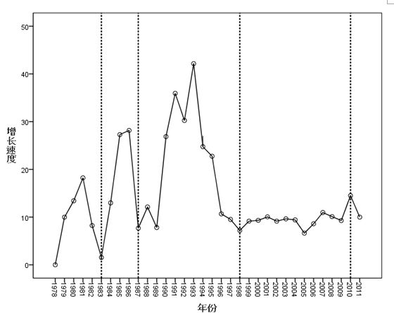 經(jīng)濟(jì)運(yùn)行過程中,增長(zhǎng)是與周期波動(dòng)相伴隨的,而經(jīng)濟(jì)增長(zhǎng)的波動(dòng)是以國(guó)內(nèi)(地區(qū))生產(chǎn)總值的發(fā)展速度波動(dòng)為主要標(biāo)志。通過對(duì)改革開放以來開平市生產(chǎn)總值的增長(zhǎng)速度運(yùn)用經(jīng)濟(jì)增長(zhǎng)的“谷—谷”法來劃分經(jīng)濟(jì)周期,研究我市經(jīng)濟(jì)發(fā)展的軌跡。經(jīng)研究發(fā)現(xiàn),我市已經(jīng)經(jīng)歷了四個(gè)經(jīng)濟(jì)周期(見圖3)。