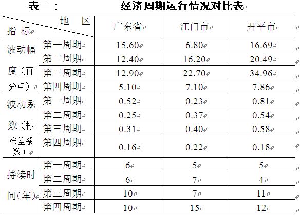 我市經(jīng)濟(jì)周期呈現(xiàn)前快后穩(wěn)的總體特征。我市經(jīng)濟(jì)在改革開放初期發(fā)展較快,在第一周期快起快落,波動(dòng)系數(shù)達(dá)0.812,在第二周期后表現(xiàn)更為快速,歷時(shí)4年完成峰谷位交替,但波動(dòng)系數(shù)下降到0.54;第三周期則受鄧小平同志南巡以及撤縣設(shè)市帶動(dòng)一大批重點(diǎn)項(xiàng)目投入上馬等促進(jìn),波動(dòng)系數(shù)比第二周期上升0.044,達(dá)0.584;在第四周期的發(fā)展,則有所放緩但表現(xiàn)平穩(wěn),波動(dòng)系數(shù)下降到0.179。具體見表一和表二: