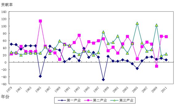 1978—2011年,開平市三次產(chǎn)業(yè)對(duì)生產(chǎn)總值的貢獻(xiàn)率均值分別是:第一產(chǎn)業(yè)15.22%、第二產(chǎn)業(yè)43.95%、第三產(chǎn)業(yè)40.83%,具體表現(xiàn)如下:第一產(chǎn)業(yè)對(duì)經(jīng)濟(jì)的貢獻(xiàn)由高到低發(fā)展。在改革開放初期對(duì)經(jīng)濟(jì)的貢獻(xiàn)達(dá)40%以上,由1985年開始呈波動(dòng)向下發(fā)展至2011年其貢獻(xiàn)率只有6.5%;第二產(chǎn)業(yè)對(duì)經(jīng)濟(jì)的貢獻(xiàn)由小到大。其在改革開放初期的貢獻(xiàn)率只有20%左右,但隨著改革開放的深入推進(jìn),尤其在工業(yè)經(jīng)濟(jì)的快速發(fā)展推動(dòng)下逐漸成為主導(dǎo)產(chǎn)業(yè),2011年對(duì)經(jīng)濟(jì)的貢獻(xiàn)率達(dá)70.94%;第三產(chǎn)業(yè)對(duì)經(jīng)濟(jì)的貢獻(xiàn)波動(dòng)不穩(wěn)。在改革開放三十多年中,第三產(chǎn)業(yè)呈與第二產(chǎn)業(yè)互補(bǔ)交替的合力之勢(shì)對(duì)經(jīng)濟(jì)發(fā)展作出貢獻(xiàn)。具體見圖4: