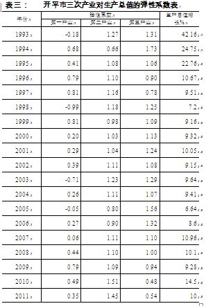以開平市1993年—2011年的三次產(chǎn)業(yè)的增長(zhǎng)速度,計(jì)算出其對(duì)生產(chǎn)總值增長(zhǎng)的彈性系數(shù),計(jì)算結(jié)果是:第一產(chǎn)業(yè)的彈性系數(shù)較小;第二產(chǎn)業(yè)的彈性系數(shù)高且較穩(wěn)定;第三產(chǎn)業(yè)的彈性系數(shù)整體較高,但在2006年開始受金融風(fēng)暴影響對(duì)經(jīng)濟(jì)的彈性系數(shù)逐步下降。具體見表三: