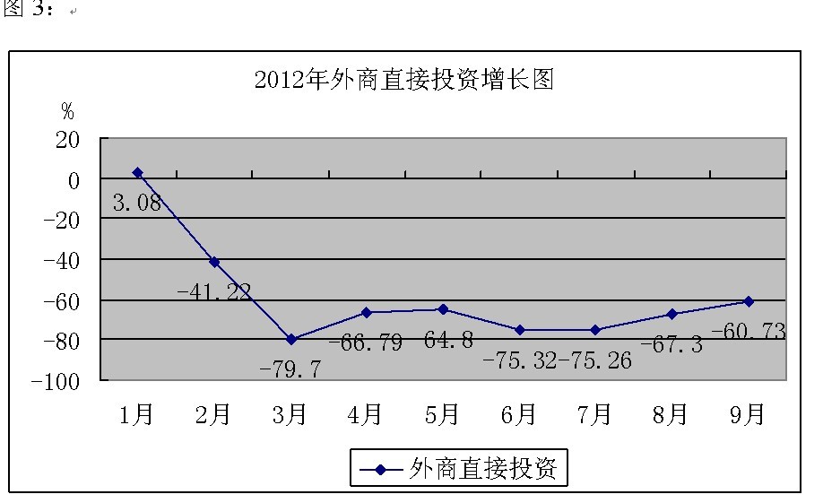 受當(dāng)前經(jīng)濟形勢的影響,我市經(jīng)濟在經(jīng)歷前段時間的波動后,在第三季度的各項指標(biāo)有升有降,有向上發(fā)展呈回穩(wěn)態(tài)勢的,也有發(fā)展末如理想的。具體情況如下: 外商直接投資方面。1—9月份,我市實際利用外商直接投資4703萬美元,只完成年度任務(wù)39.82%,同比下降60.73%,已連續(xù)8個月在負(fù)增長里徘徊。見圖3: (三)園區(qū)經(jīng)濟進入發(fā)展期