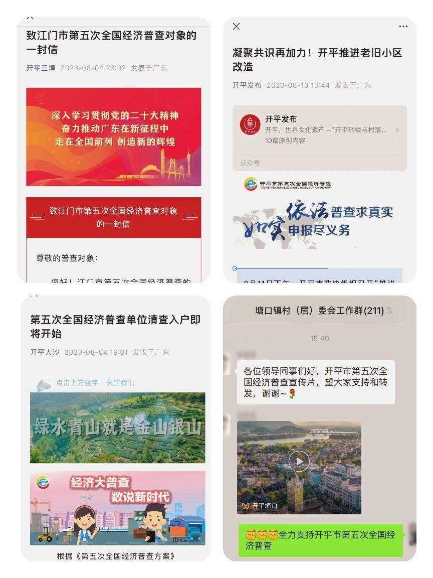 為扎實推進開平市第五次全國經濟普查工作,有效提高廣大普查對象對經濟普查的知曉率,動員廣大普查對象依法配合普查、積極參與調查。我市有關部門、各街道掀起宣傳熱潮,形成宣傳合力,擴大五經普宣傳的覆蓋面和影響力。 一是在新型媒體宣傳上,充分利用媒體的靈活性、多樣性,通過市和鎮兩級微信公眾號、政務網等平臺發布五經普宣傳資料,向社會公眾普及經濟普查法律法規和工作意義。借助電視、廣播、電臺等線上媒介傳播優質的五經普宣傳,錄制以情景對話的音頻在電臺滾動播放五經普宣傳內容。同時充分利用微信工作群及朋友圈功能轉發公眾號推文,以線上快速便捷的宣傳方式,促進五經普宣傳內容在普查對象之間的傳播,進一步提高普查對象積極配合參與的意愿,擴大五經普宣傳工作的影響力。 二是在傳統宣傳方式上,市普查辦積極整合多方資源,利用各種公益宣傳渠道,在轄區內人流密集的居住區、商業中心區、重要路段及橋梁燈箱等地張貼五經普宣傳海報、懸掛標語橫幅和大型戶外廣告牌;借助公交車影響面廣的突出優勢,在公交車車身粘貼五經普宣傳廣告;印刷經普宣傳海報、制作印有經普宣傳語的工作袋等;充分利用政府部門、村(居)委會、商業區等地的戶外電子顯示屏投放五經普宣傳標語,將五經普宣傳內容深入傳播到全市的各個角落,營造依法普查的濃厚氛圍。 下一步,我市將持續深入進行普查宣傳,加強與各鎮街的溝通,充分發揮各鎮街的宣傳優勢和特色,形成上下聯動、協調協同、共同發力的良好宣傳工作局面,為后續的入戶清查工作夯實基礎。宣傳先行,開平市全面拉開五經普宣傳帷幕