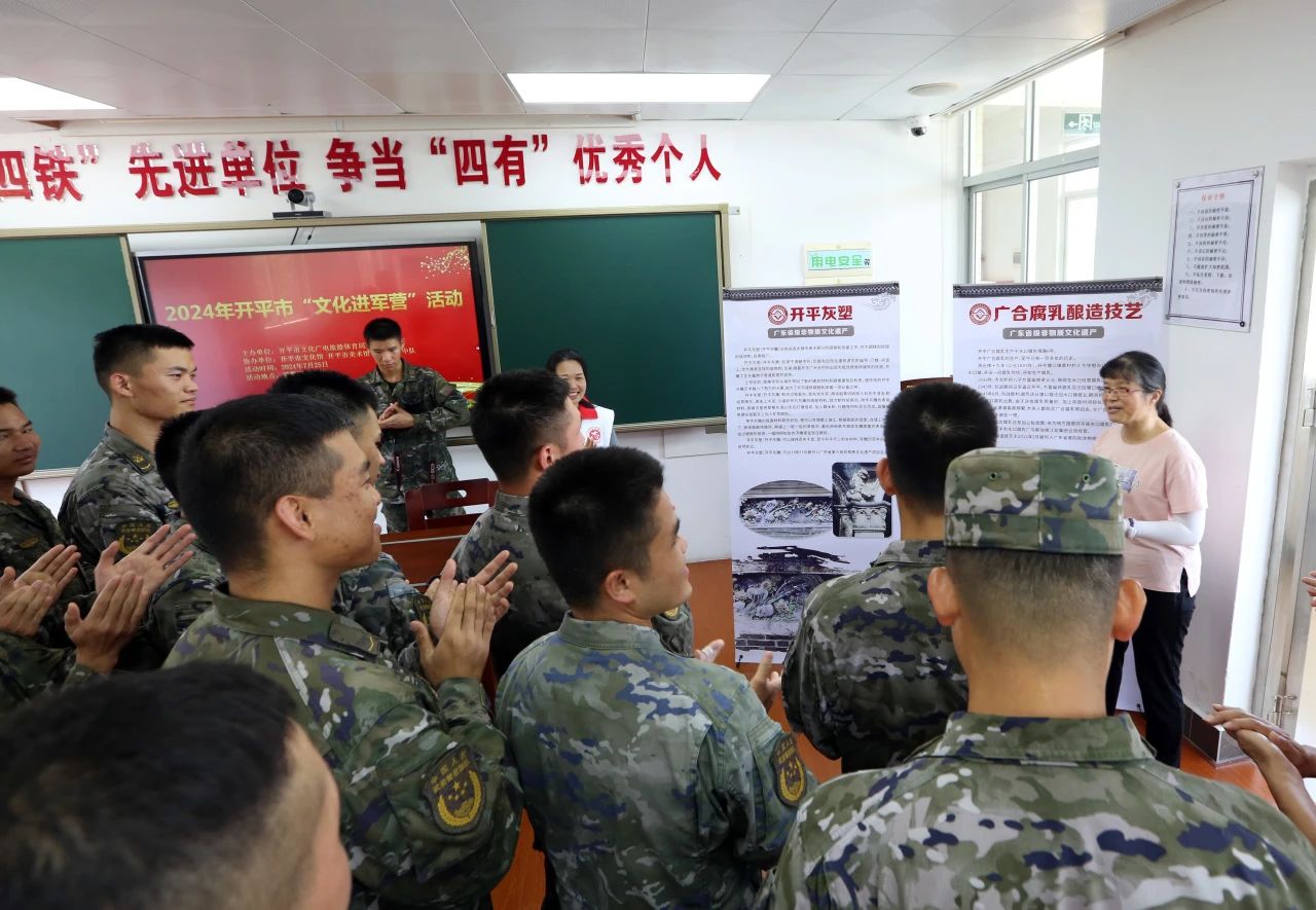 在部隊駐地,官兵們首先觀看了開平非遺圖文展覽,了解開平市的泮村燈會、開平民歌、開平灰塑、金聲獅鼓制作技藝、廣合腐乳釀造技藝等非物質(zhì)文化遺產(chǎn)項目的歷史和內(nèi)涵。