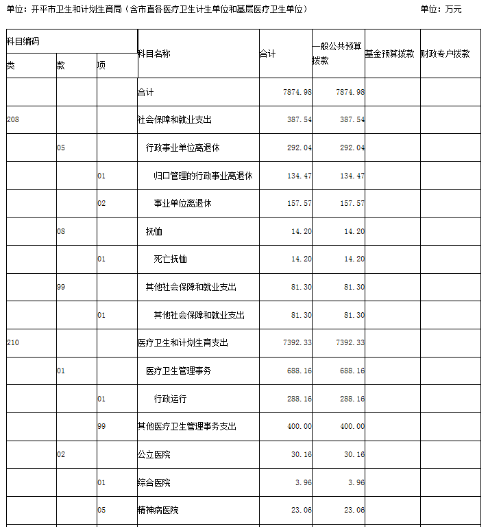2014 年度開平市衛生和計劃生育局 決算公開 第一部分 2014年開平市衛生和計劃生育局決算基本情況說明 一、部門基本情況 (一)部門機構設置、職能 開平市衛生和計劃生育局是主管開平市衛生計生工作的職能部門。主要職能: 1、貫徹執行國家、省和江門市有關衛生和計劃生育、中醫藥工作的法律法規和方針政策以及市委市政府有關工作部署,擬訂衛生和計劃生育以及促進中醫藥事業發展的規劃。負責協調推進我市醫藥衛生體制改革和醫療保障,統籌規劃衛生和計劃生育服務資源配置,指導區域衛生和計劃生育規劃的編制和實施。 2、負責疾病預防控制工作,協調有關部門對重大疾病實施防控與干預,組織實施免疫規劃工作。制定衛生應急和緊急醫學救援預案、突發公共衛生事件監測和風險評估計劃,組織和指導突發公共衛生事件預防控制和各類突發公共事件的醫療衛生救援。報送突發公共衛生事件應急處置信息。組織開展食品安全風險監測、評估和交流。 3、組織開展職業衛生、放射衛生、環境衛生、學校衛生、公共場所衛生、飲用水衛生管理的檢測、調查、評估和監督,負責傳染病防治監督。 4、負責組織擬訂基層衛生和計劃生育服務、婦幼衛生發展規劃和政策措施,指導全市基層衛生和計劃生育、婦幼衛生服務體系建設,推進基本公共衛生和計劃生育服務均等化,完善基層運行新機制和鄉村醫生管理制度。 5、負責醫療機構和醫療服務的行業準入管理并監督實施。落實醫療機構及其醫療服務、醫療技術、醫療質量、醫療安全以及采供血機構管理的規范、標準,實施衛生專業技術人員準入、資格標準,制定和實施衛生專業技術人員執業規則和服務規范,建立醫療機構醫療服務評價和監督管理體系。 6、負責組織推進公立醫院改革,建立公益性為導向的績效考核和評價機制,建設和諧醫患關系,提出醫療服務和藥品價格政策的建議。 7、組織實施國家藥物政策和基本藥物制度,提出基本藥物價格政策的建議。 8、貫徹落實國家生育政策,完善生育管理政策,組織實施促進出生人口性別平衡的政策措施,組織監測計劃生育發展動態,提出發布計劃生育安全預警預報信息建議。組織實施計劃生育技術服務管理制度。組織實施優生優育和提高出生人口素質的政策措施,推動實施計劃生育生殖健康促進計劃,降低出生缺陷人口數量。 9、組織建立計劃生育利益導向、計劃生育特殊困難家庭扶助和促進計劃生育家庭發展等機制。負責協調推進有關部門、群眾團體履行計劃生育工作相關職責。 10、負責衛生和計劃生育信息化建設,加強全員人口信息系統建設,參與全市人口基礎信息庫建設。 11、組織落實流動人口計劃生育服務管理制度,推動建立流動人口流入地、流出地衛生和計劃生育信息互聯互通和公共服務工作機制。 12、組織擬訂全市衛生和計劃生育人才發展規劃,指導衛生和計劃生育人才隊伍建設。加強全科醫生等急需緊缺專業人才培養,建立完善住院醫師和專科醫師規范化培訓制度并指導實施。 13、組織擬訂衛生和計劃生育科技發展規劃,組織實施衛生和計劃生育相關科研項目。協同指導院校醫學教育和計劃生育教育,組織實施畢業后醫學教育和繼續醫學教育。 14、指導鎮村衛生和計劃生育工作,完善綜合監督執法體系,規范執法行為,監督檢查法律法規和政策措施的落實,組織查處重大違法行為。組織實施人口與計劃生育目標管理責任制的考評工作。監督落實計劃生育一票否決制。 15、負責衛生和計劃生育宣傳、健康教育和健康促進等工作,依法組織實施統計調查。組織指導交流合作與援外工作,開展與港澳臺的交流與合作。 16、承擔市愛國衛生運動委員會、市深化醫藥衛生體制改革工作領導小組和市人民政府防治艾滋病工作委員會的日常工作,負責市重大活動與重要會議的醫療衛生保障工作。 17、承辦市人民政府、上級衛生和計劃生育部門交辦的其他事項。 現設11個內設機構。納入部門決算編制有27個(含下屬單位)行政(事業)單位,包括:行政單位開平市衛生和計劃生育局;事業單位開平市中心醫院、開平市第二人民醫院、開平市第三人民醫院、開平市婦幼保健院、開平市中醫院、開平市衛生財務結算中心、開平市計劃生育服務站、開平市流動人口計劃生育管理服務中心、開平市皮膚防治站、開平市結核病防治所、開平市玲瓏醫院、開平市水口醫院、14家基層衛生院。 (二)人員構成情況 開平市衛生和計劃生育局公務員編制35人,雇員編制6人,目前實有公務員32人,雇員6人,離退休40人。下屬事業單位編制3084人,實有在編人員2278人,編外人員945人,離退休1046人。 (三)決算年度的主要工作任務 醫藥體制改革實現穩步推進;基層衛生院非稅收入實現恢復性增長;計劃生育工作實現平穩開展;醫療服務水平實現逐步提升;基本公共衛生服務實現均等化,2014年我市基本公共衛生服務經費落實人均35元,保障了國家基本公共衛生服務項目的開展;醫療質量管理實現逐步規范化;愛衛紅會工作實現穩步推進;行風政風建設實現基本好轉。 二、收入決算說明 2014年部門收入103,822.11萬元(含市直各醫療衛生計生單位和基層醫療衛生單位),其中:一般公共預算收入14,377.23萬元,占13.85%;基金預算收入70.59萬元,占0.07%。事業收入88,116.35萬元,占84.87%;其他收入203.94萬元,占0.2%