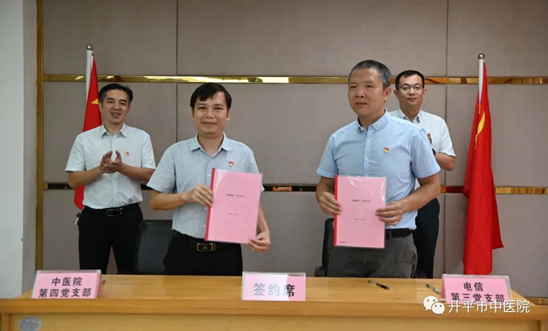 來源:開平市中醫(yī)院 為搭建醫(yī)企黨建交流合作平臺,做好信息化智慧化醫(yī)院建設工作。11月8日下午,開平市中醫(yī)院黨委副書記、院長胡敏超帶隊到中國電信開平分公司開展“黨建翼聯(lián)”結對共建活動。 結對共建 活動中,開平市中醫(yī)院黨政領導胡敏超、陳緣超、周建洲與中國電信開平分公司領導劉勇、梁煉忠、梁活光、劉偉權舉行了座談會,開平市中醫(yī)院黨委副書記、院長胡敏超與中國電信開平分公司黨委書記、總經(jīng)理劉勇分別介紹了各自黨組織的基本概況和黨建工作開展情況。雙方表示,將以此次黨建共建結對合作為契機,積極探索創(chuàng)新黨建活動新形式,發(fā)揮各自優(yōu)勢,統(tǒng)籌雙方資源,推動雙方黨建實現(xiàn)資源互享、互利共贏、共同發(fā)展。 開平市中醫(yī)院第四黨支部和中國電信開平分公司第三黨支部建立黨建結對關系。今后,雙方以支部共建為平臺,深入交流、相互促進,不斷擴大黨建結對“朋友圈”,發(fā)揮黨建引領強大合力。 胡敏超講話 劉勇講話 簽約儀式 在大家的見證下,開平市中醫(yī)院第四黨支部書記譚偉雄同志與中國電信開平分公司第三黨支部書記張懷韜同志代表雙方簽訂“黨建翼聯(lián)”結對共建協(xié)議。 會后,雙方黨員參觀中國電信開平分公司信息化展廳,并觀看中國電信在醫(yī)療云、數(shù)據(jù)機房建設、網(wǎng)絡安全保障等項目案例介紹,對紅色電信的發(fā)展史及中國電信在信息化建設方面的實力、優(yōu)勢有了更直觀的了解。 通過本次簽約,雙方結對共建達成合作共識,為進一步深化醫(yī)企互動,實現(xiàn)黨建業(yè)務深度融合搭建了橋梁。下一步,雙方將堅持以共建促黨建,以黨建促發(fā)展,創(chuàng)新工作模式,提高服務創(chuàng)新能力,譜寫黨建工作與合作共贏新篇章。