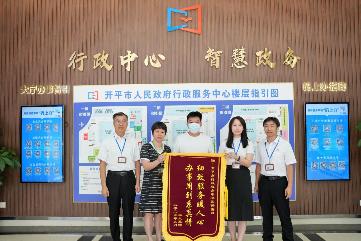 9月11日上午,市民梁先生前往開平市行政服務中心,向市醫保中心駐市行政服務中心窗口贈送“細致服務暖人心 辦事周到系真情”的錦旗。梁先生對醫保工作人員提供的服務表示高度的認可和贊賞。