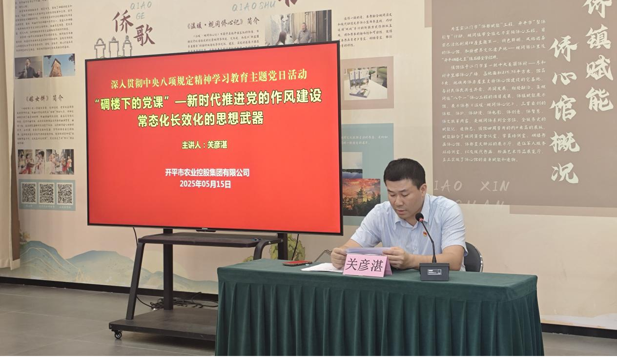 為開展深入貫徹中央八項規定精神學習教育,學習領會習近平總書記關于加強作風建設的重要論述精神,提升市屬國有企業黨員干部黨性修養,增強為民服務意識。5月15日、16日,市農控集團組織全體黨員干部前往蜆岡鎮中堅樓僑心館開展“碉樓下的黨課”主題黨日活動。 活動期間,市農控集團黨委書記關彥湛、紀委書記關天峰分別以“新時代推進黨的作風建設常態化長效化的思想武器”為題,給黨員們講授作風建設黨課。 大家一致認為,貫徹中央八項規定精神不僅是全面從嚴治黨的內在要求,更是推動企業發展的重要保障。要認真學習領會習近平總書記關于加強黨的作風建設的重要論述,傳承弘揚黨的優良作風,嚴格遵守中央八項規定及其實施細則精神,樹立正確的政績觀和事業觀,以更加飽滿的熱情和更加務實的作風,投身到各項工作中去,通過不斷提高自身的政治素質和黨性涵養,為企業的持續健康發展貢獻自己的力量。 活動中,黨員們還前往廣東圣迪樂村生態食品有限公司,參觀了該公司現代化生產線和養殖基地。圣迪樂公司是“百縣千鎮萬村高質量發展工程”中的重要項目,通過引進先進的養殖技術和管理經驗,提高了農產品的質量和產量,推動了農業產業的升級,在鄉村振興戰略中發揮了引領作用。 本次主題黨日活動形式多樣,既有現場“沉浸式”理論學習,又有實地參觀。黨員們不僅深刻認識到中央八項規定精神的重大意義,還親身感受到了鄉村振興戰略的實施成果。大家紛紛表示,要將此次活動的收獲轉化為工作動力,為推動市屬國有企業高質量發展作出更大貢獻。
