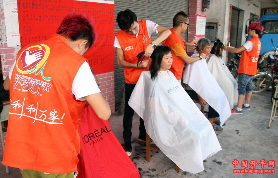 據(jù)悉,這是義工聯(lián)首次組織社區(qū)義工到鄉(xiāng)鎮(zhèn)開展活動。早上八點左右,僑園社區(qū)15名義工攜帶相關(guān)的活動工具來到塘口鎮(zhèn),在距離鎮(zhèn)政府不到3公里的魁崗村陳氏大樓布置現(xiàn)場。大樓門口四張椅子一字排開,義剪隊為村民理發(fā),還有“導(dǎo)師”負(fù)責(zé)現(xiàn)場指導(dǎo)學(xué)員;樓內(nèi)原始點按摩義工隊為有需要的群眾進行按摩。