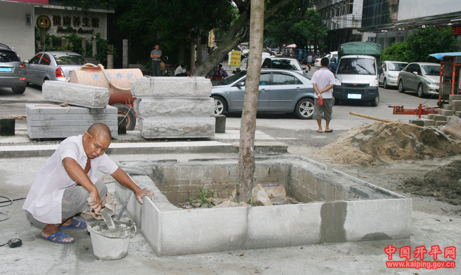 改造前的開華路街心小公園地面凹凸不平,部分地方已破裂,容易積水,樹木側石已陳舊破損,高低不一,整個公園環境比較臟亂。為改變舊貌,創造休閑娛樂文明場所,市政府從7月開始對其進行改造。記者在現場看到,本次改造主要是拆除舊地面,重鋪水泥地面,安裝排水管,砌樹木側石,貼花崗巖板。市園林局有關負責人表示,計劃在小公園內設置石凳及健身器材,爭取7月底完工。