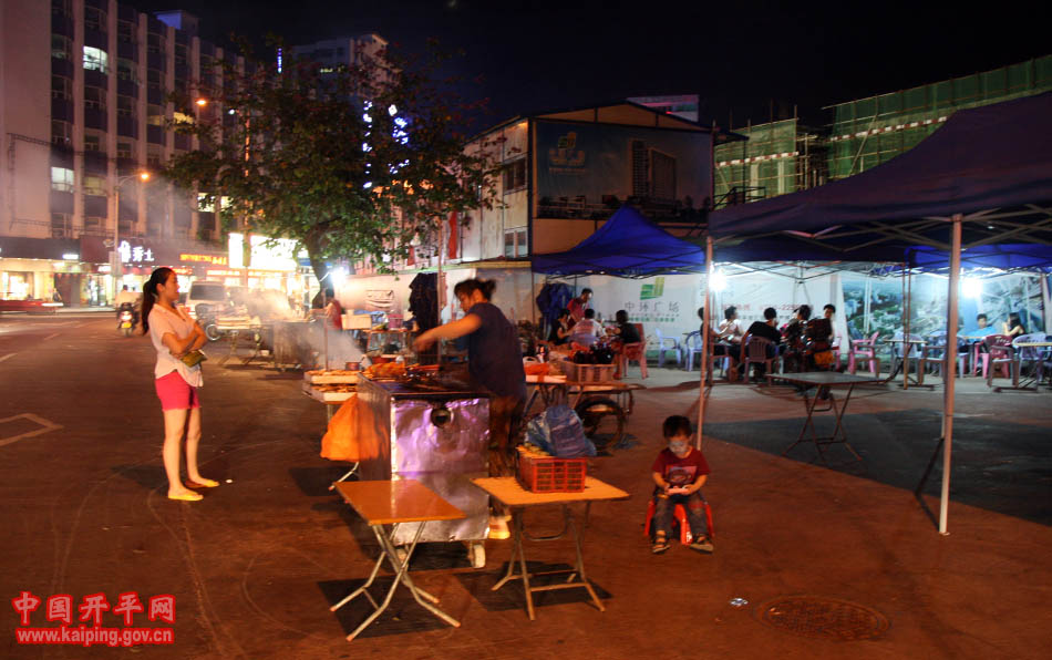 督查組發現晚上十點左右,文新路(長沙公園前)流動燒烤檔陸陸續續開始擺攤,已率先“營業”的攤檔吸引了不少市民幫襯。由于長沙公園改造工程正在進行,流動燒烤檔的桌椅、燒烤爐等沿著工程外墻一字排開,使得路面原本就不寬的文新路更加緊張,占地經營嚴重阻礙了正常的交通秩序,油煙彌漫更影響市容市貌。