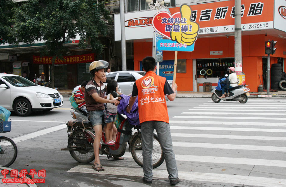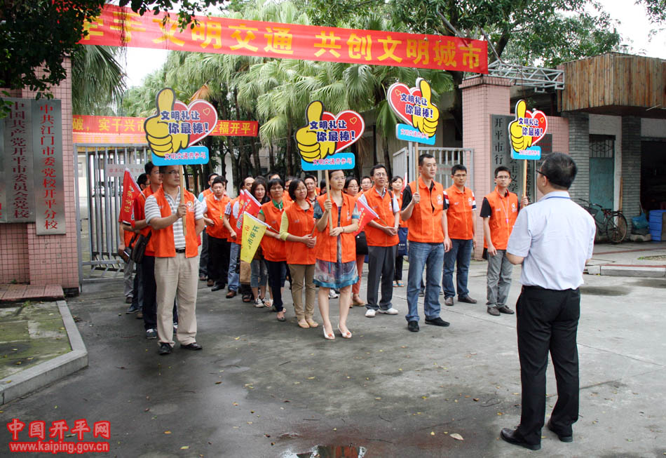 參與活動的中青年干部都是開平市2013年中青年干部培訓二班的學員,他們分成4個小組,分別在幕沙橋頭、開平市汽車總站、僑園路、城市文化廣場南廣場等紅綠燈交通繁忙的路段,對不文明的交通行為進行勸導,引導市民自覺遵守交通規則,文明出行。