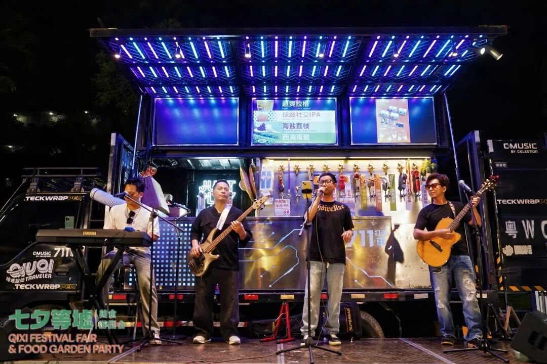 本次活動徹底打破了傳統節慶活動的舉辦模式。承辦方IE公社作為一個匯聚本土及外來創客青年的平臺,在此次“七夕等墟”活動中,從策劃、設計到攤位招募、現場執行,均由青年團隊一手包辦。活動現場,阿曳、哈吉他(haha)等音樂人,以及LazyLady雷技雷帝樂隊、噪樂時空樂團等特色樂隊輪番獻藝,通過民謠、電子、搖滾等多種音樂形式與觀眾熱烈互動。歌聲與光影完美交融,音符點亮夏日夜晚,構筑起一座連接古今、溝通你我的音樂"鵲橋",贏得現場觀眾的熱烈掌聲。