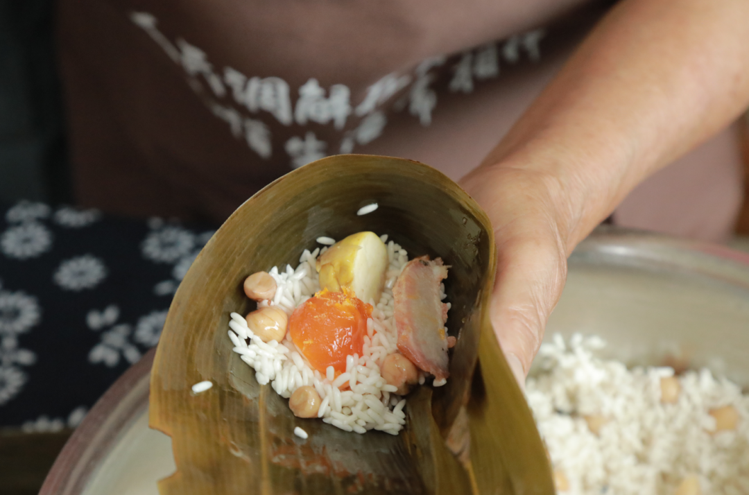 百合鎮儒東村村民:“我們在包粽子應節。我們的粽子餡料很豐富,有栗子、瑤柱、叉燒、豬肉、臘腸、蝦米等。”